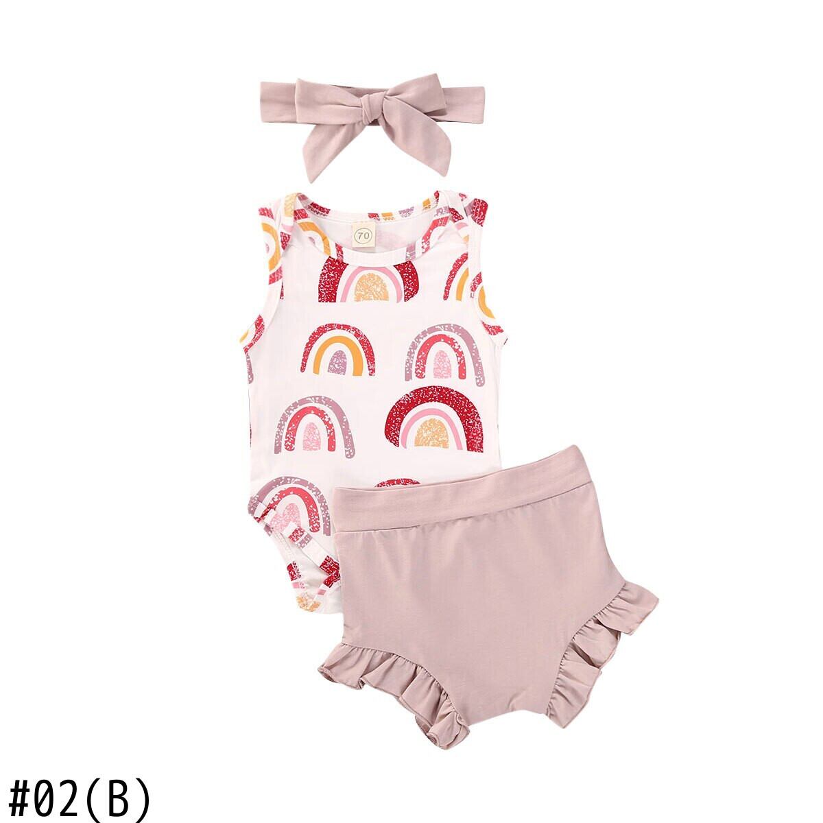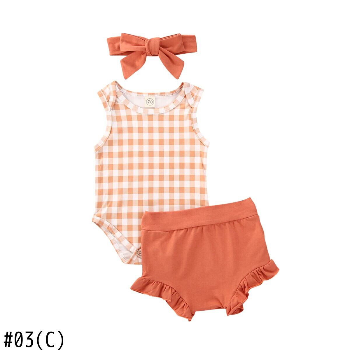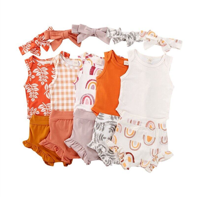 新作 2020ベビーサマー幼児ベビーガール男の子服ノースリーブフリルロンパーストップスウエストショーツヘッドバンド衣装セット