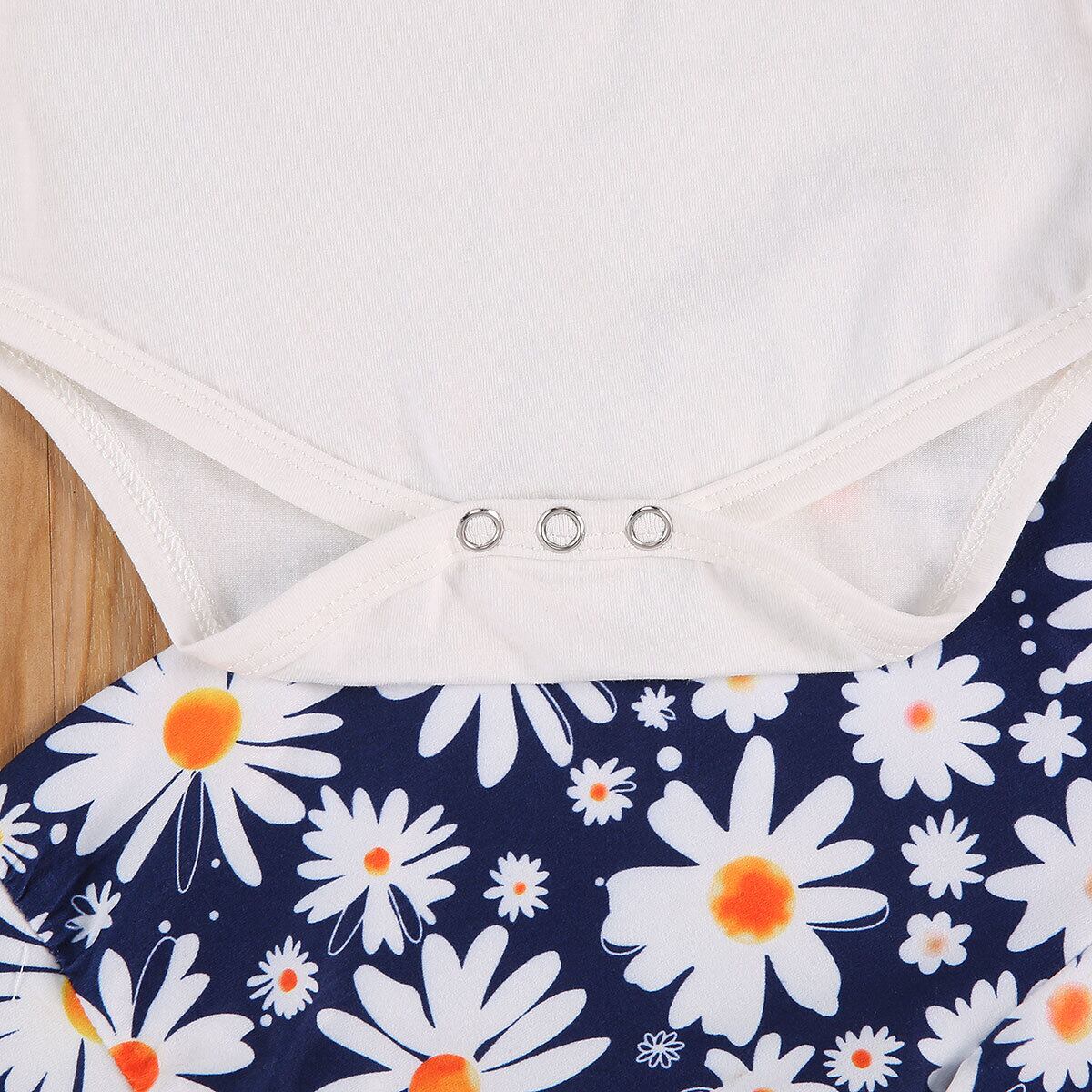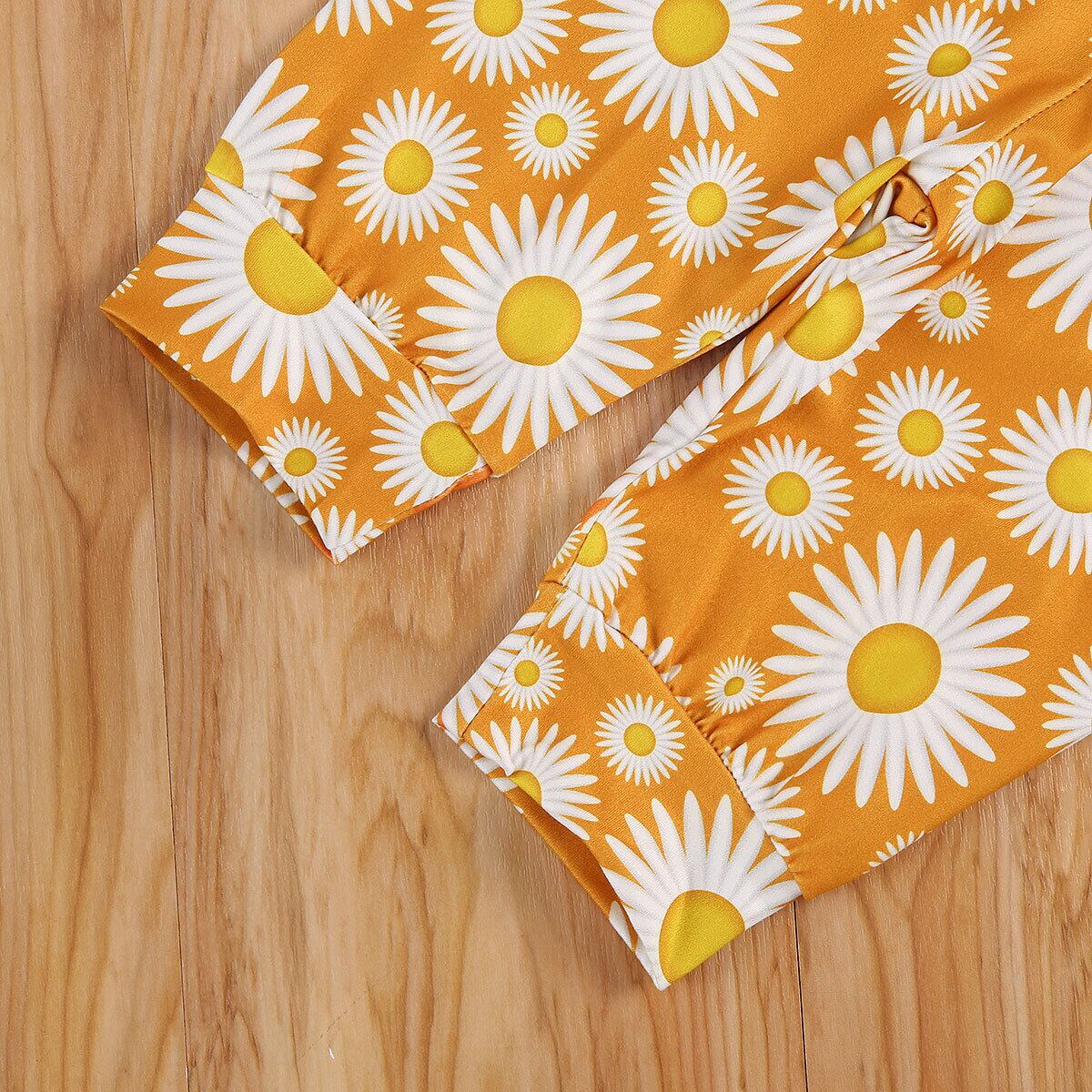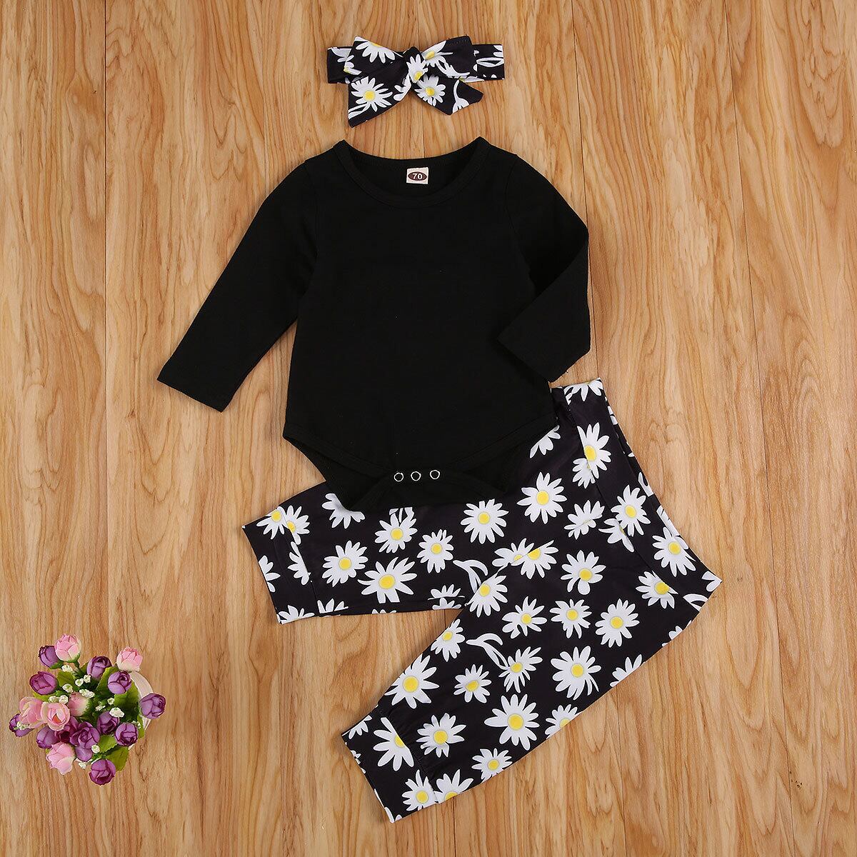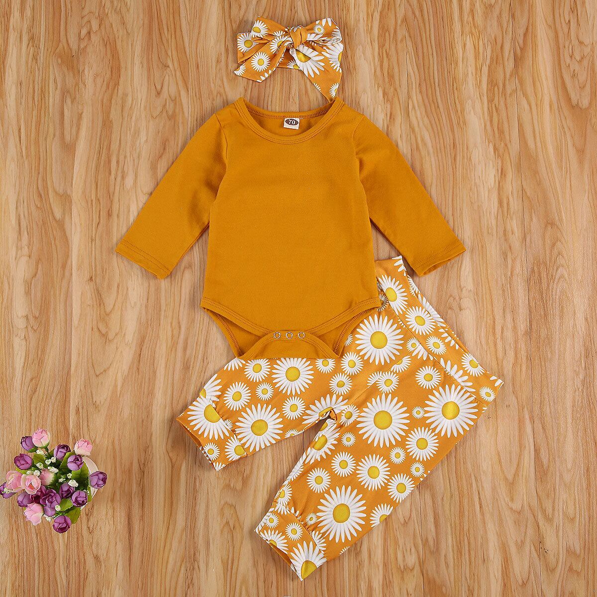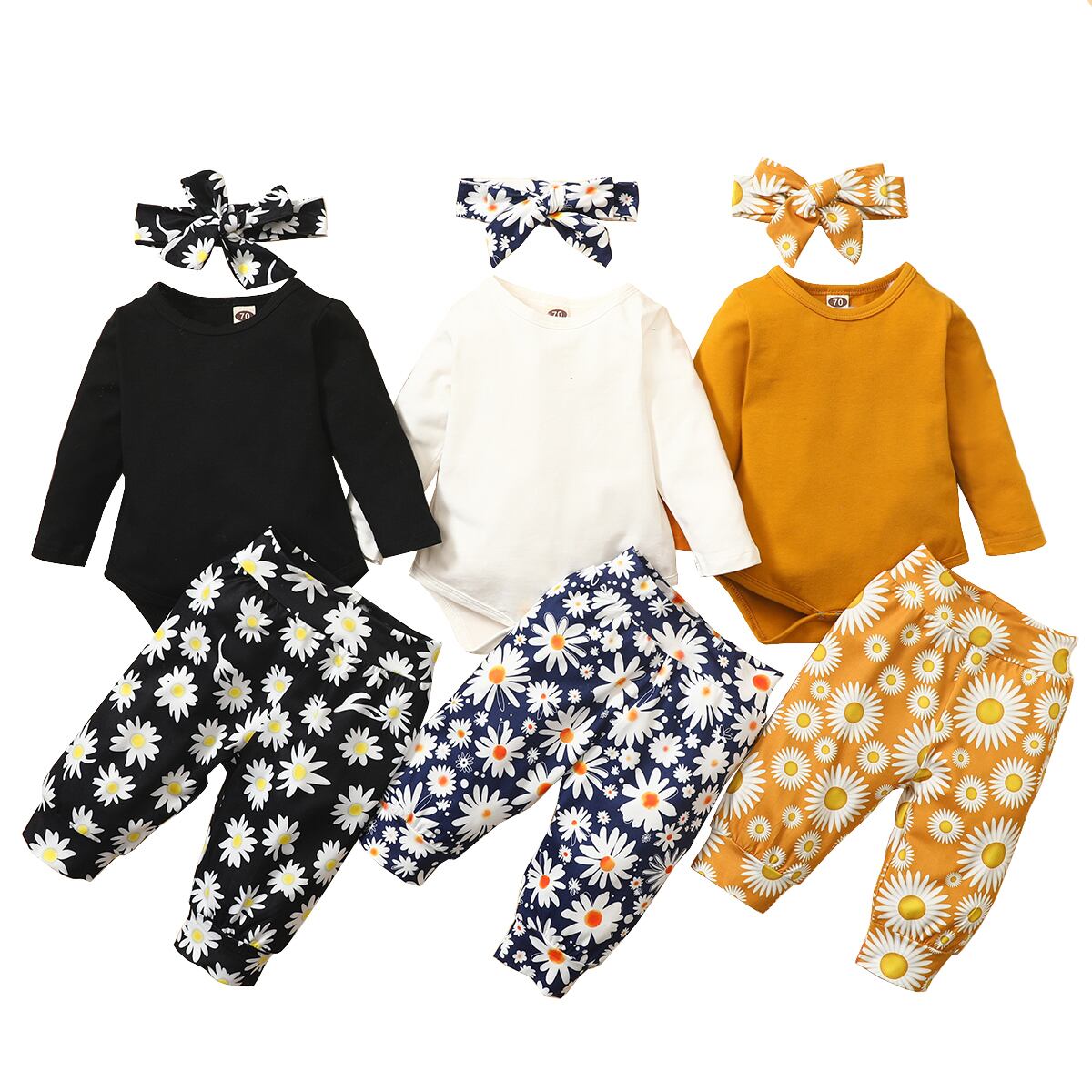 新作 3個のベビーオータムスーツ無地の長袖ロンパース+デイジープリントパンツ+ヘッドバンド幼児の女の子、0〜2歳