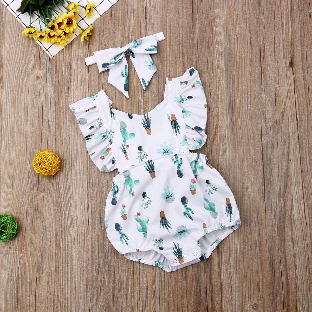 新作 0-24M幼児生まれの女の赤ちゃんフリルロンパースサボテンプリントジャンプスーツ夏のベビー服