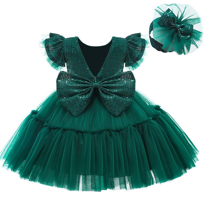 新作 子供用宴会服Seノースリーブフリル裾チュールドレススパンコール+蝶結びヘッドドレス