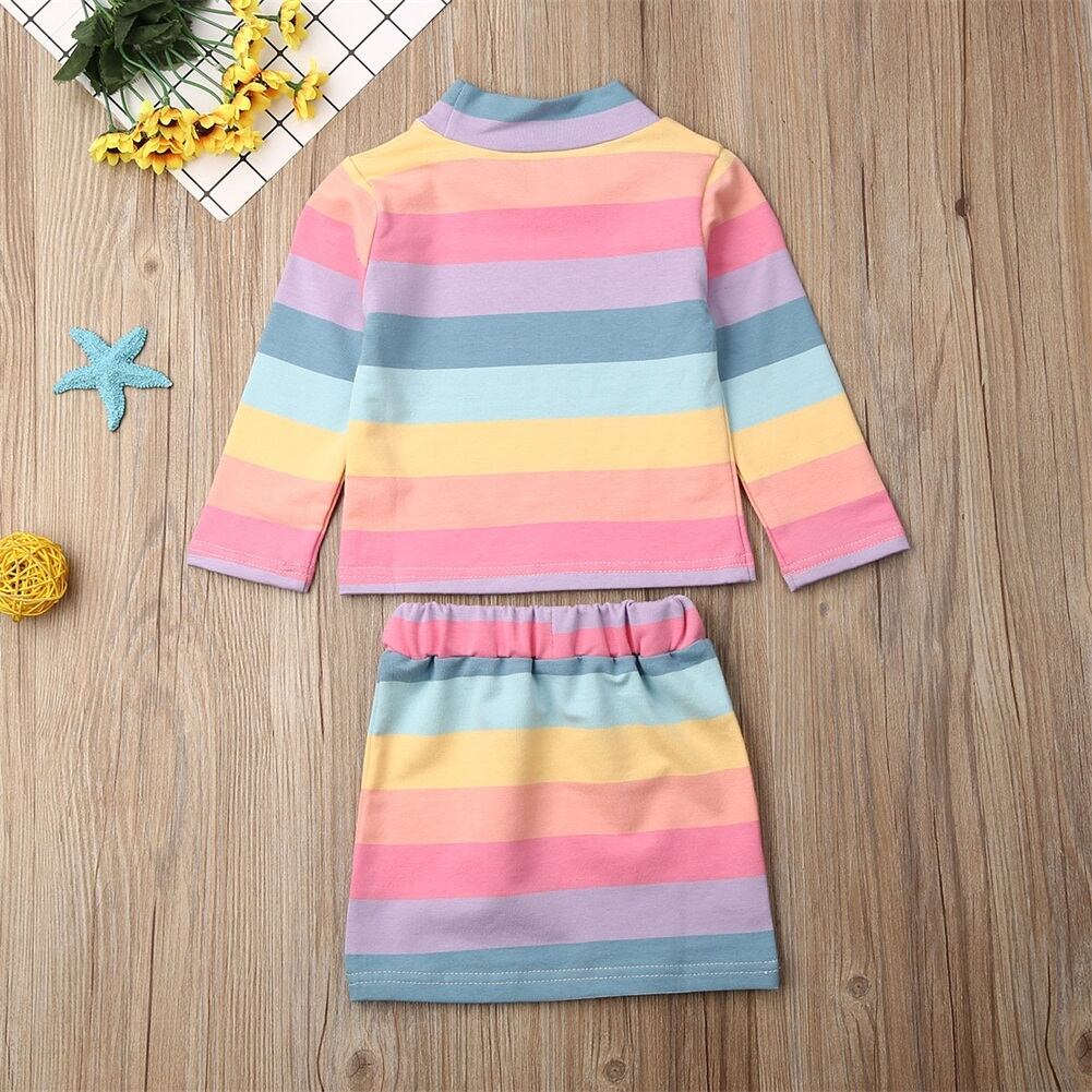 新作 2PCS幼児キッズベビーガールレインボーカラーストライプ長袖Tシャツトップス+ヒップスカートドレス衣装服1-6Y