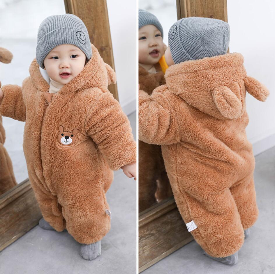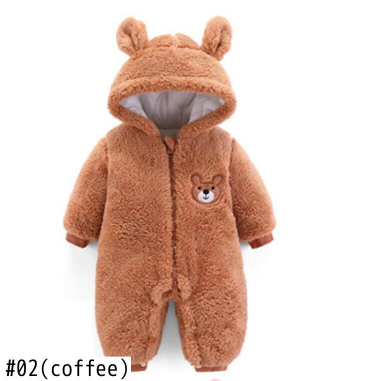 新作 ベビーロンパース長袖漫画クマ毛皮生まれの男の子女の子ジャンプスーツ服冬フーディー無地幼児のトップ