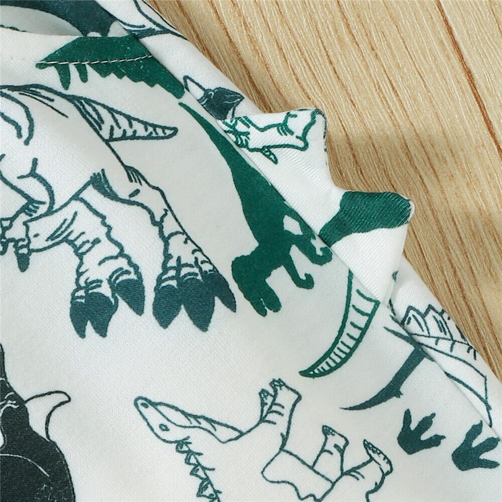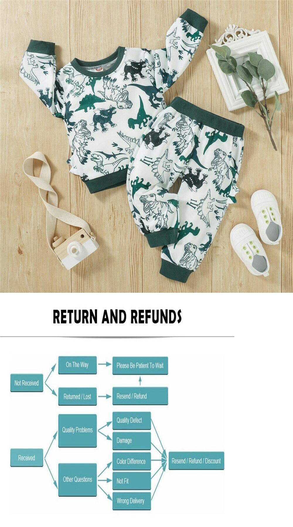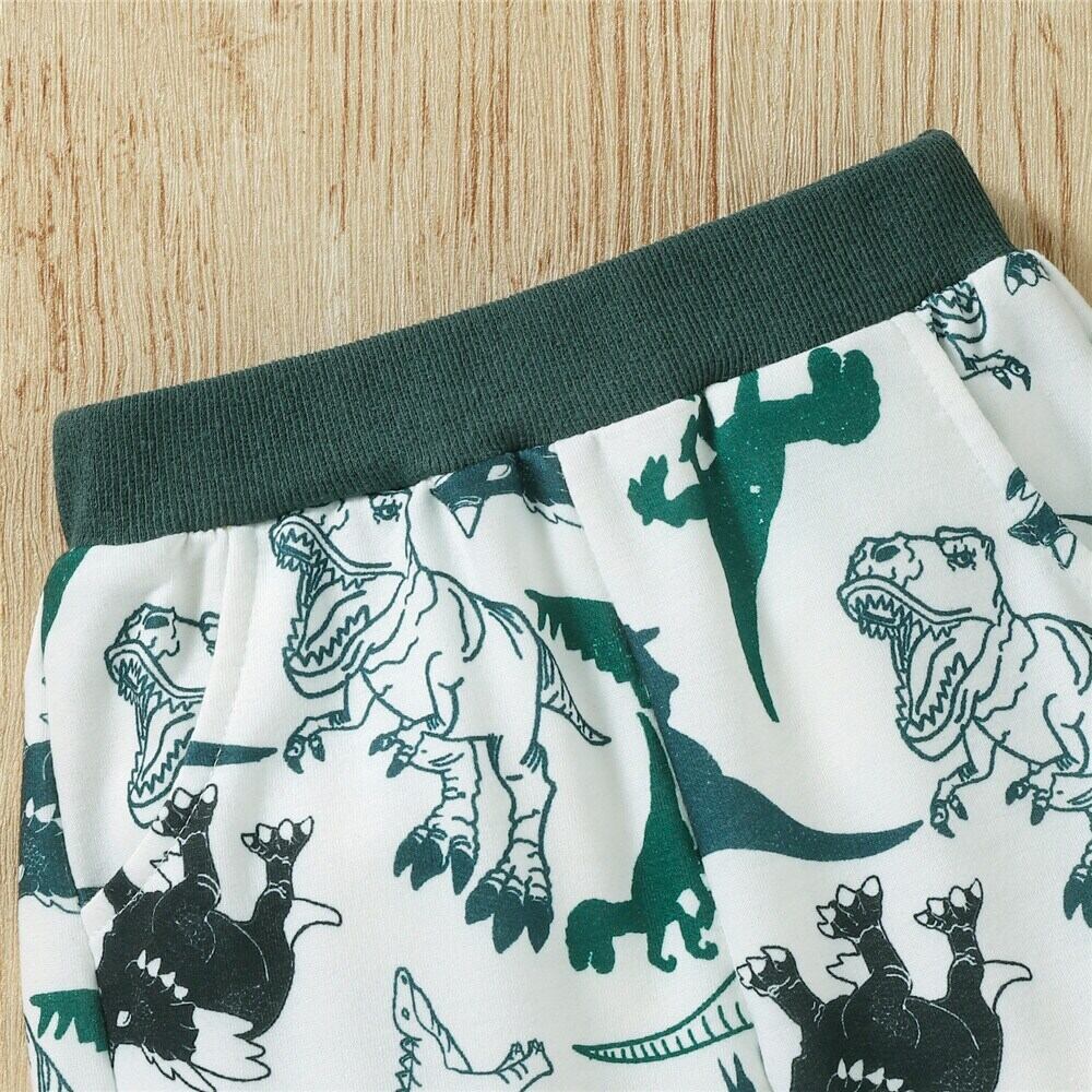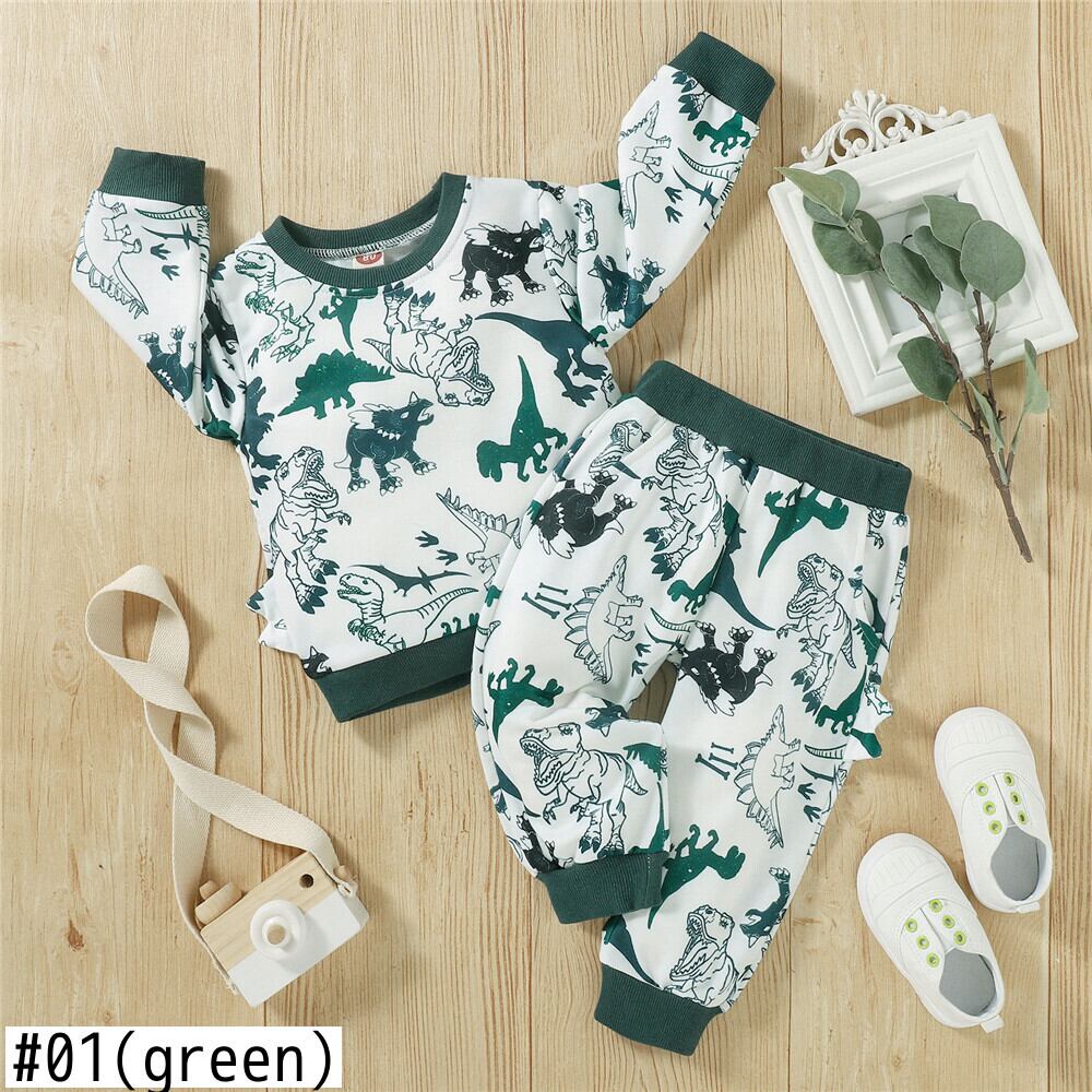 新作 秋冬ベビーボーイズツーピース洋服セットキッズウォームダークグリーン恐竜プリントプルオーバートップスウェットシャツとパンツ