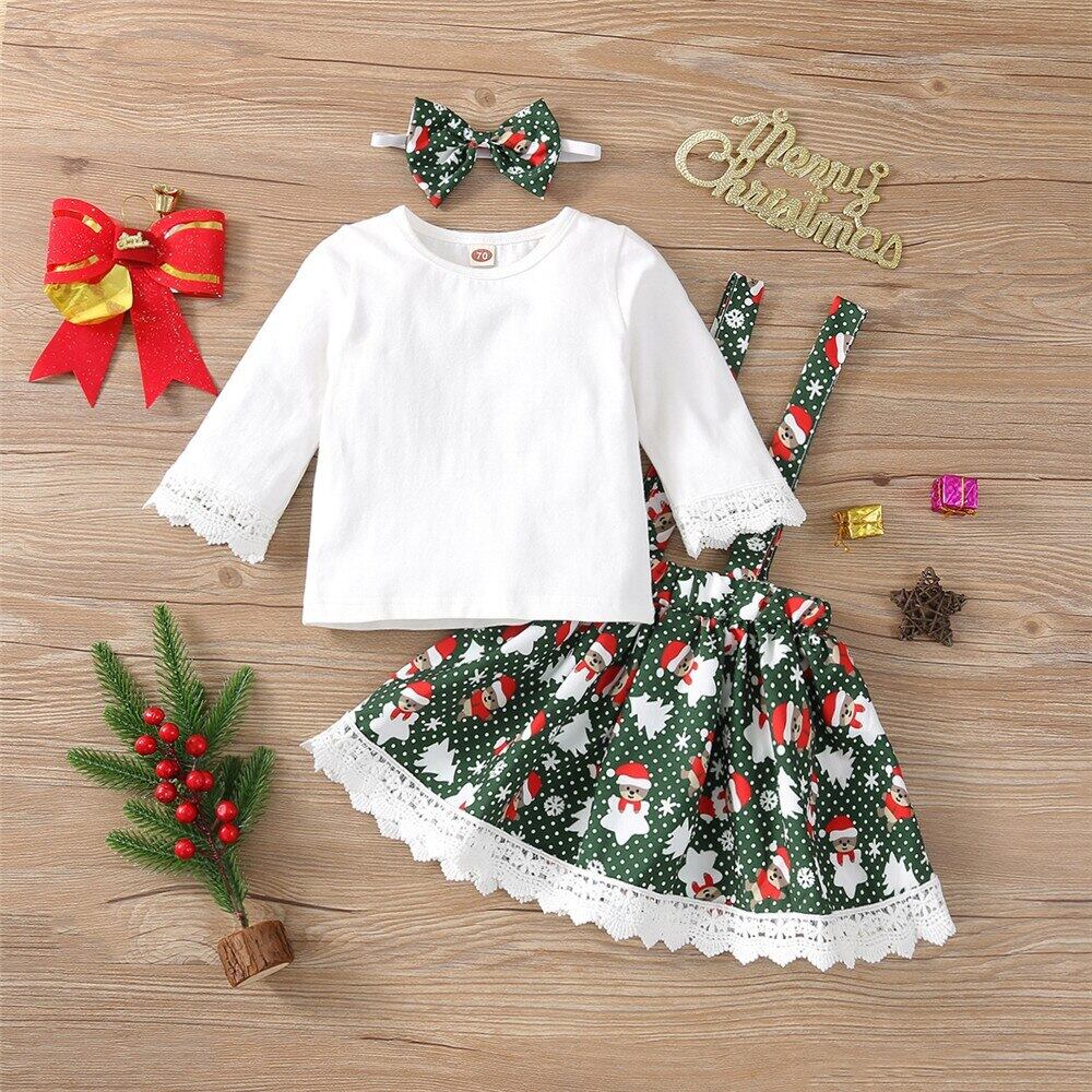 新作 クリスマススノーマンプリントガール3Pcsベビーセット生まれの長袖ホワイトプルオーバーウエストレースサスペンダースカートヘッドバンド付き
