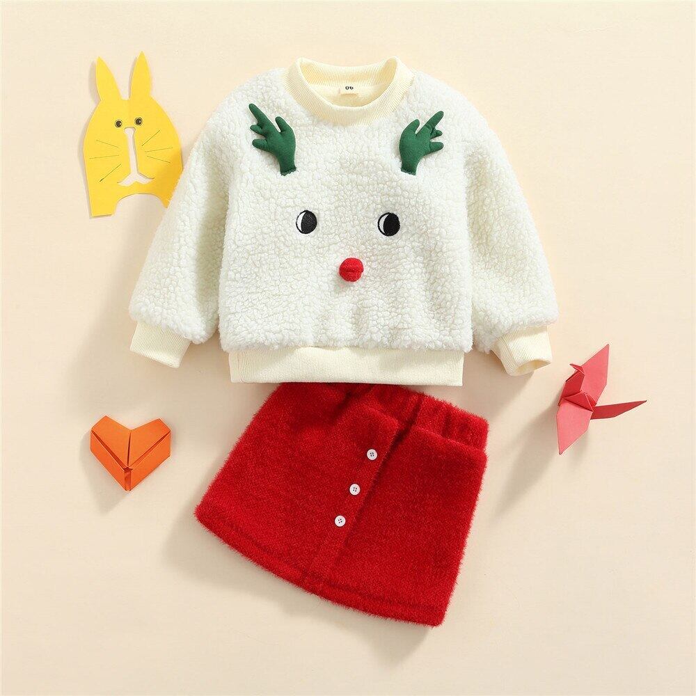 新作 女の子のクリスマスぬいぐるみ子供用セットフリース漫画エルク長袖セータープルオーバー+赤いスカート秋冬キッド