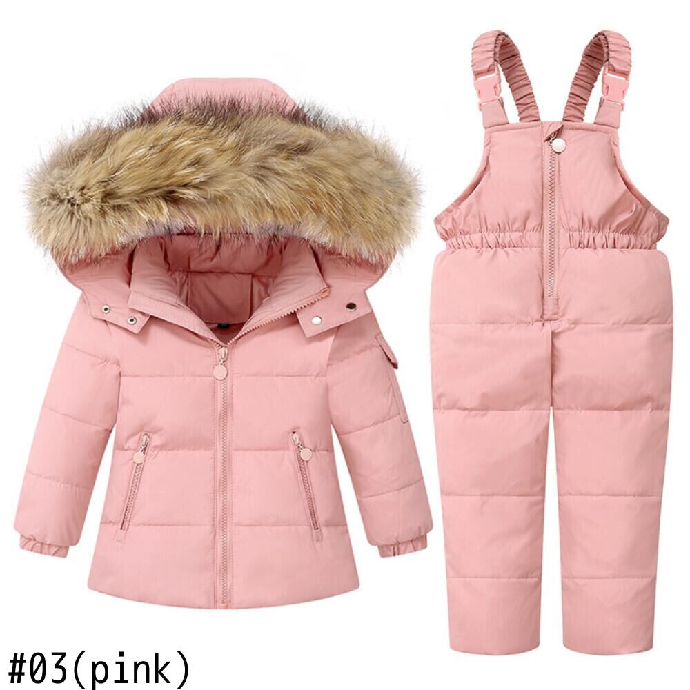 新作 2021年冬のベビーガールズ2PCセットウォームチルドレンダウンジャケットガールスノースーツベビースキースーツガールズダウンアウターコート+パンツ