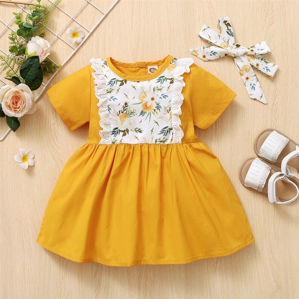 新作 9M-3Tガールズサマーレーストリム半袖ドレス、ヘッドバンドフローラルプリントAラインドレスイエロー