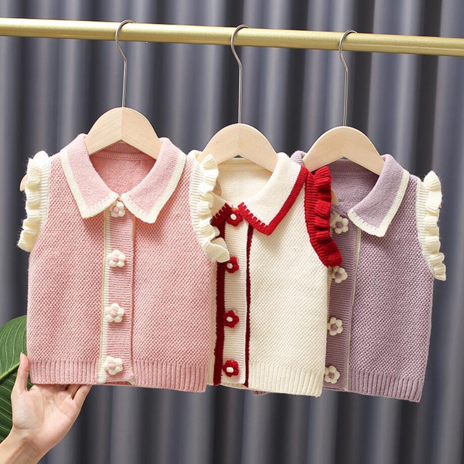 新作 キッズニットコットンベストベビーガールズニットノースリーブセーター子供用アウトウェアトップウォームフリルレースセーターベスト1-5年