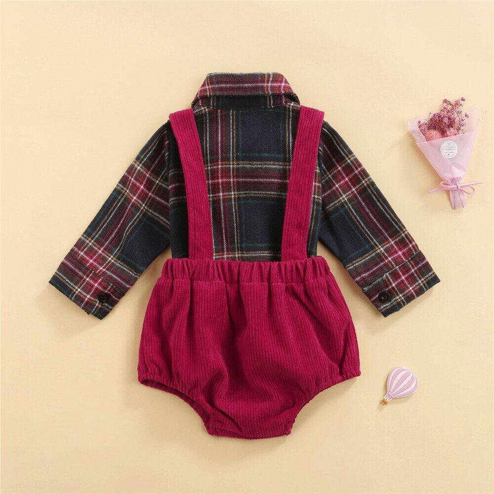 新作 2個幼児クリスマス衣装キッズベイビーボーイズシングルブレスト長袖ラペルチェックシャツボウ+無地オーバーオール