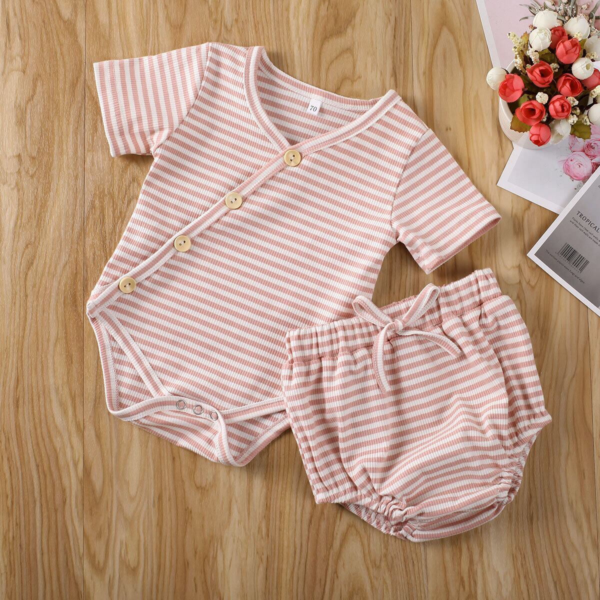 新作 2020年ベビーサマー服生まれベイビーボーイガール綿100%衣装セットストライプリブロンパーストップスショーツパンツサンスーツ