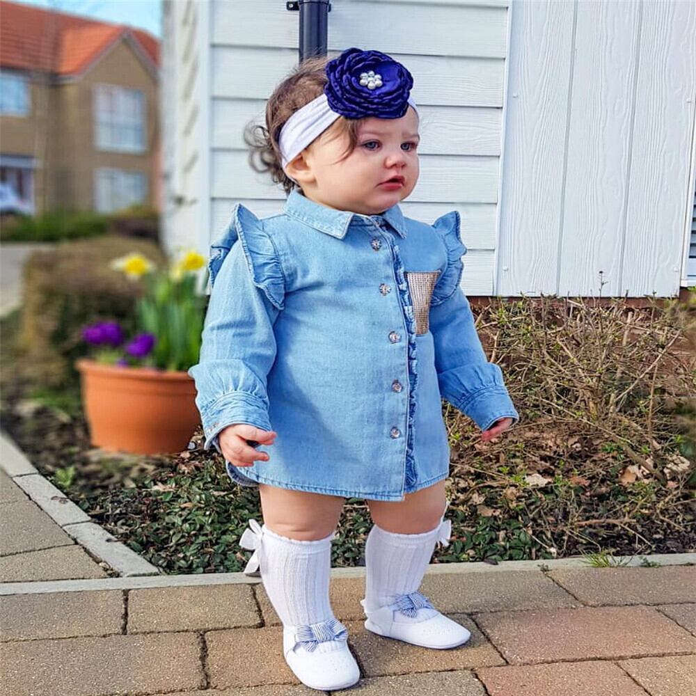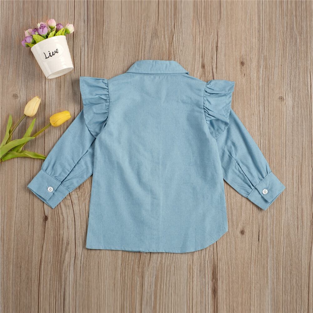 新作 2-7T幼児ベビーガールズ春デニムシャツかわいいキッズフリルブルー長袖ブラウス秋ラペルソフトコートジャケット