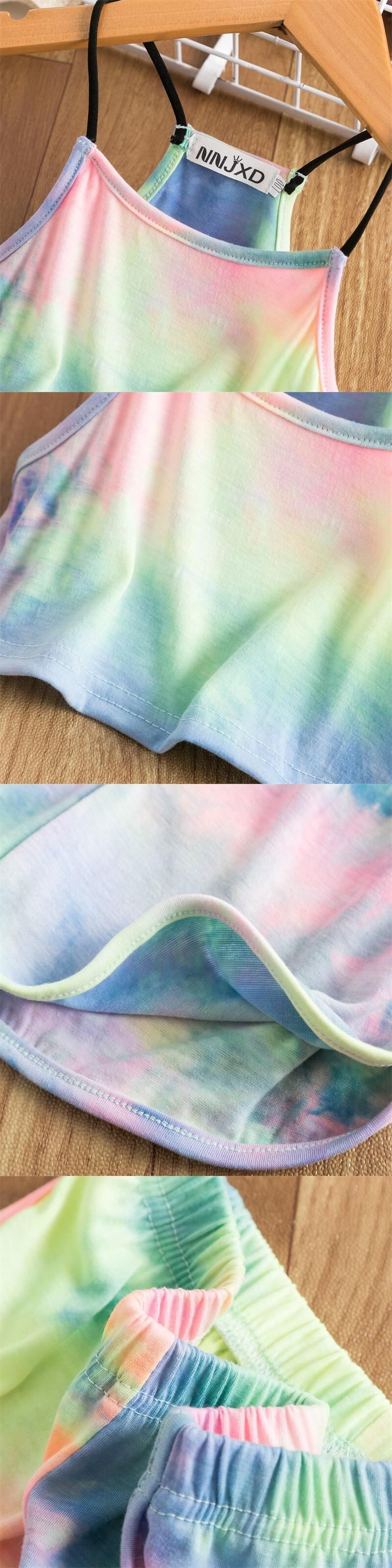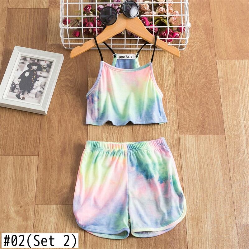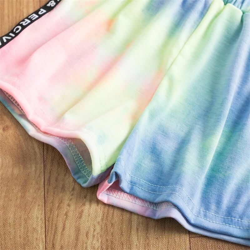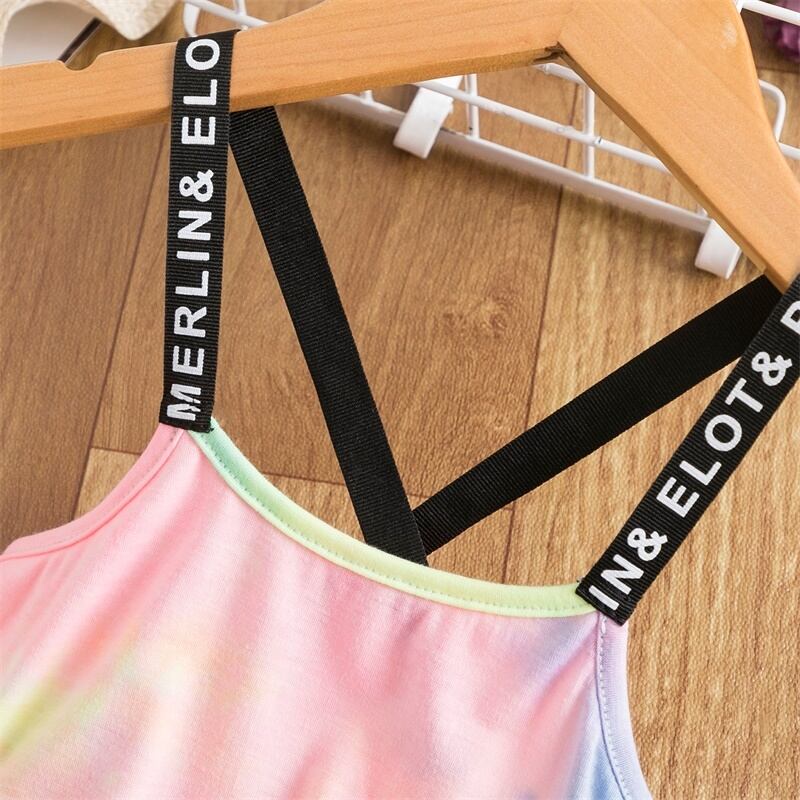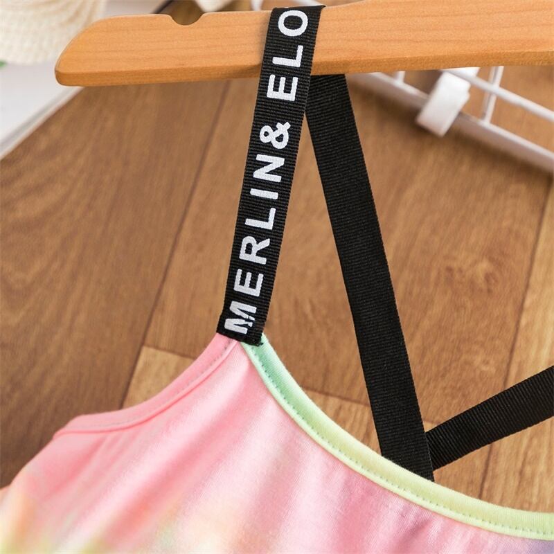 新作 ガールズベストセットノースリーブサマーチルドレンバックレスストラップトップ+ショートパンツスポーツトラックスーツキッズエラスティックウエスト衣装