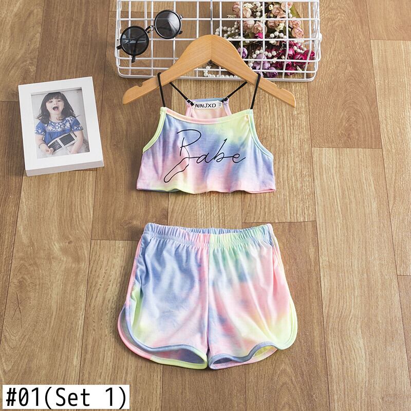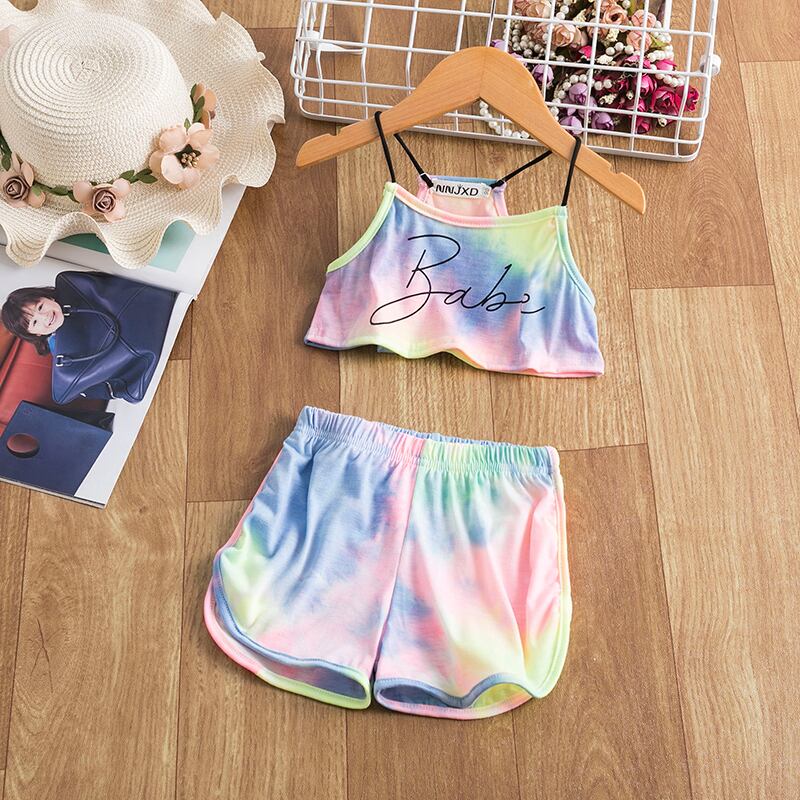 新作 ガールズサマーウェアセットノースリーブストラップスリングベストキッズエラスティックショーツパンツ2ピースクロップトップチルドレンビーチヴェスティドス