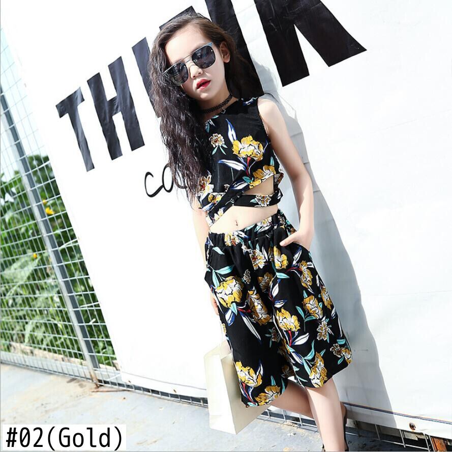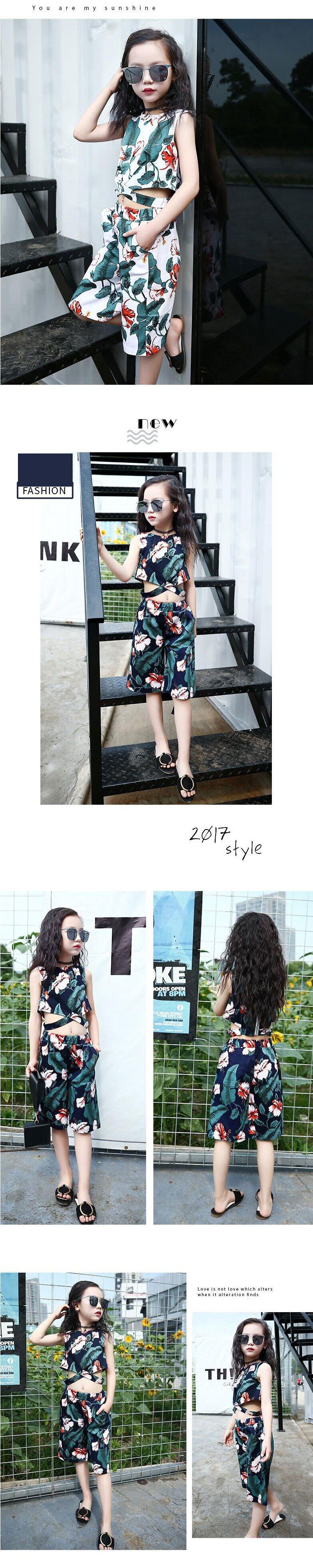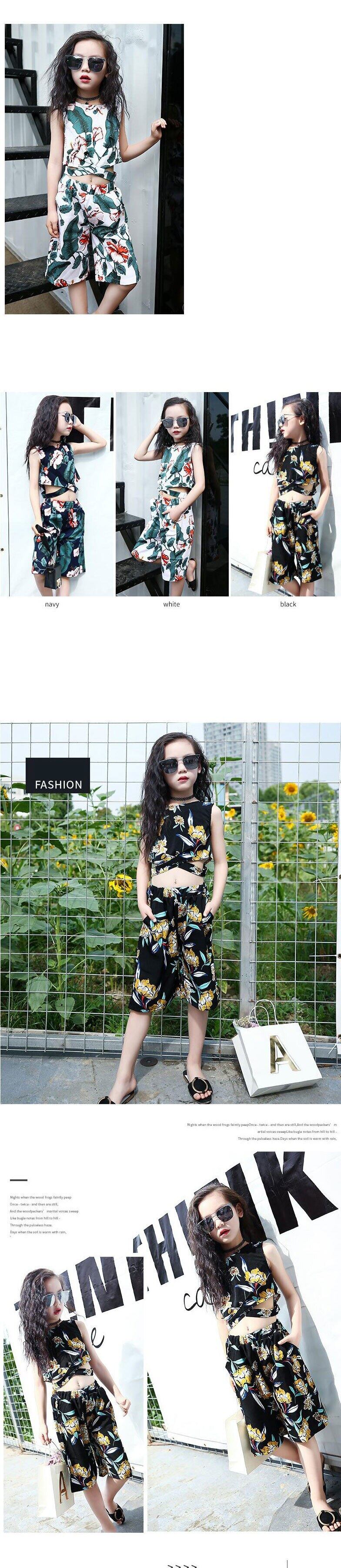 新作 2018年新作ドレスカジュアルドレスノースリーブウエストプリントシャツ+ワイドレッグパンツ2PCガールズパンツ洋服スーツ4-12Y