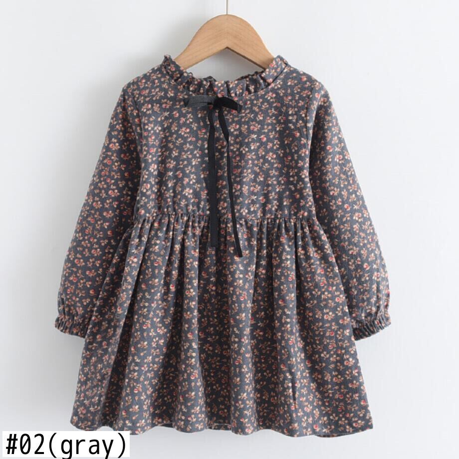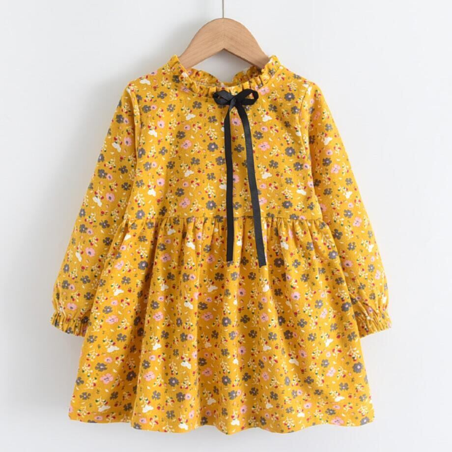 新作 秋の子供用ドレスガールズベビーコットンフローラル長袖ドレスベビーキッズリボンボウドレス