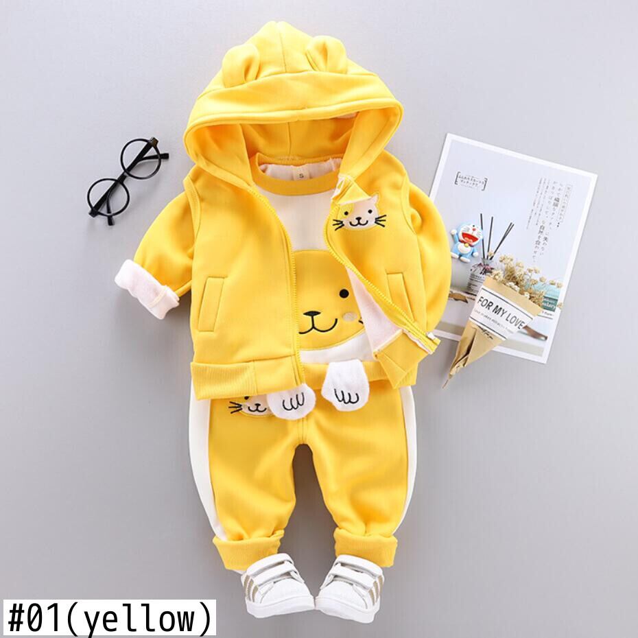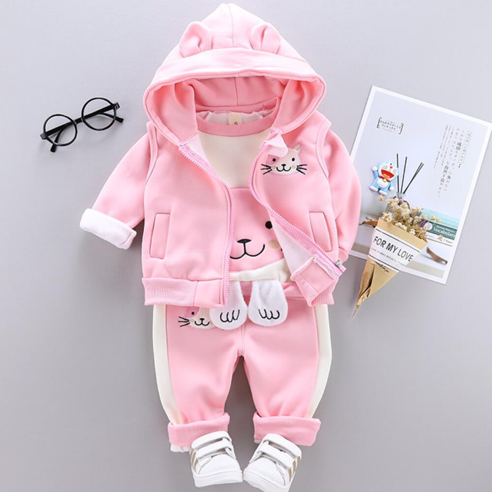 新作 秋冬子供3pcsセット女の赤ちゃんOUtfit漫画猫厚いフリースセーターパーカーベストパンツスポーツスーツ暖かい