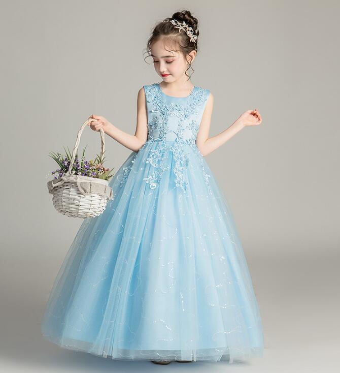 新作 女の子ウエディングドレスフラワーアップリケノースリーブボールガウン2019キッドウェディングパーティードレス女の子5-14歳