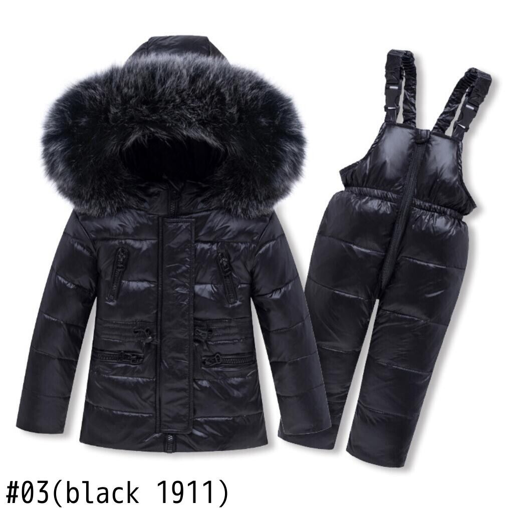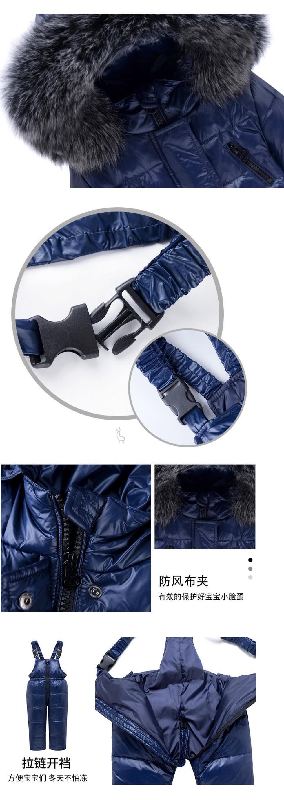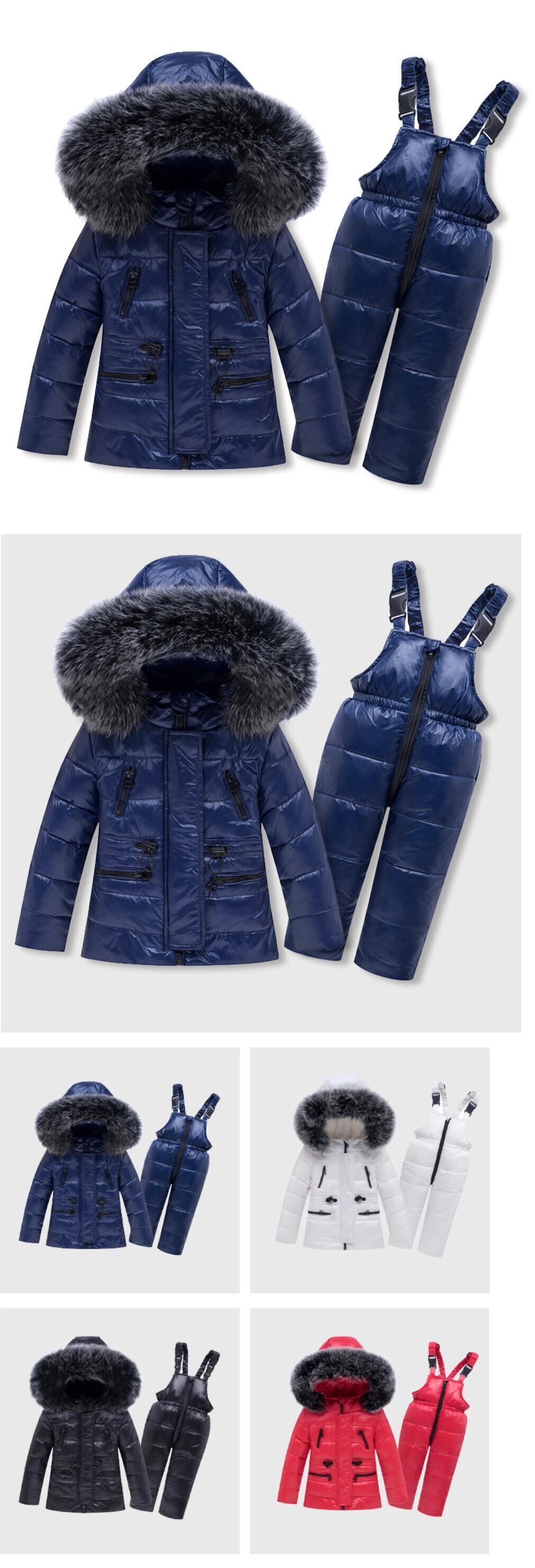 新作 暖かい冬の子供服セット男の子スキースーツスノースーツ本物の毛皮の女の子ダウンジャケットアウターコート+サスペンダージャンプスーツ