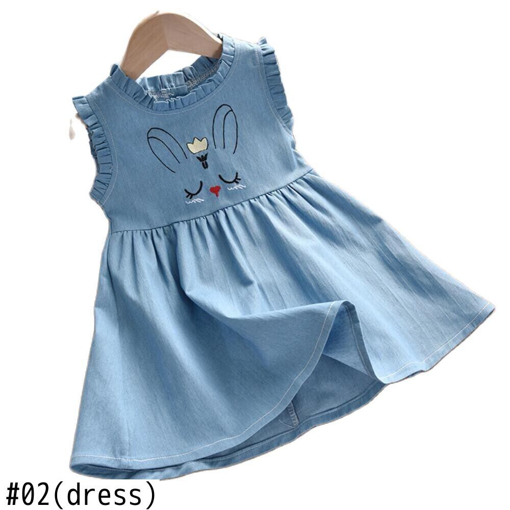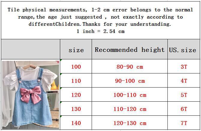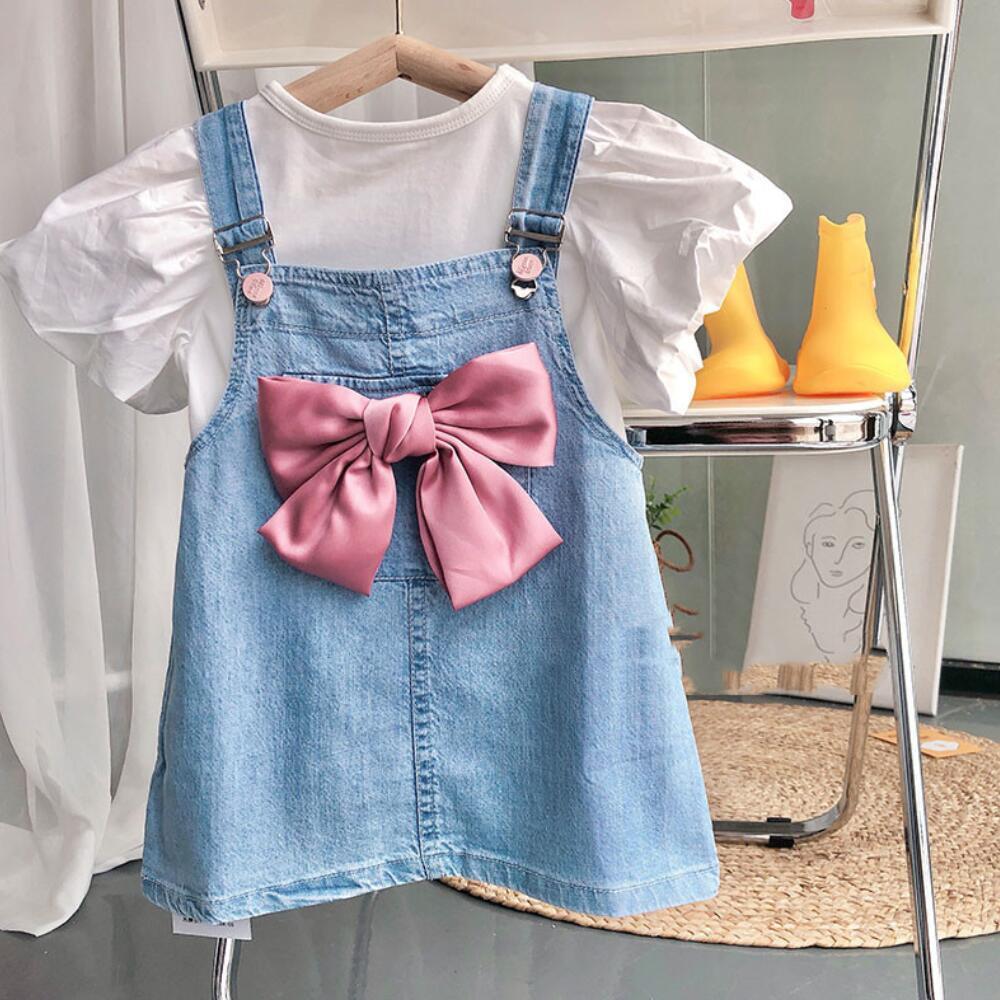 新作 ガールズカウボーイストラップドレス衣装ビッグボウノット子供服ベビーキッズホワイトふくらんでいる袖トップ+デニムドレス2点セット