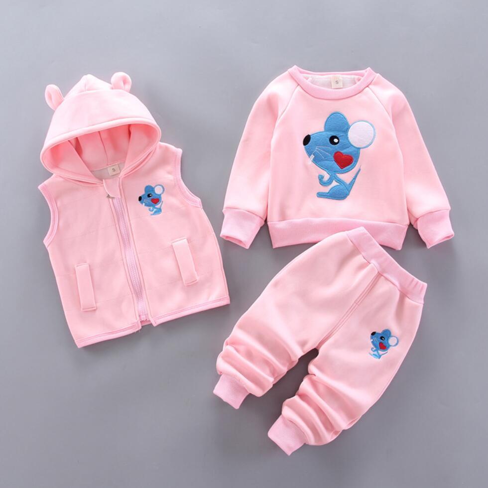 新作 1〜4歳の赤ちゃん冬子供服セット女の子子供漫画マウス厚いフリースフード付きベストパンツ3pcsスーツ男の子暖かい服装