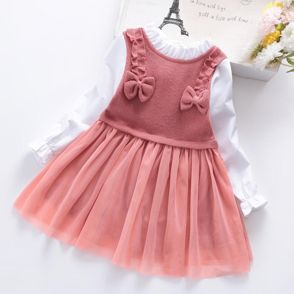 新作 春の幼児キッズスウィートスクールスタイルドレスベビーガールチュールパッチワークスーツフラワーボウシャツドレス子供パーティー