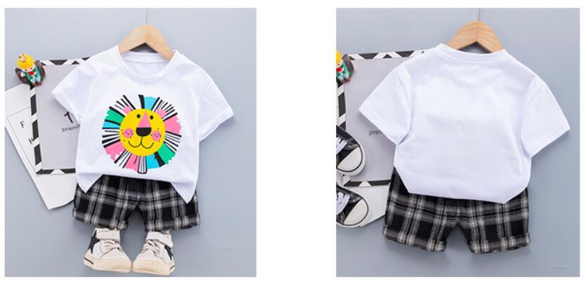 新作 ボーイズステストラックスーツ2ピースセット漫画ライオンクールトップTシャツ+チェック柄ショーツ夏の子供服1-5歳