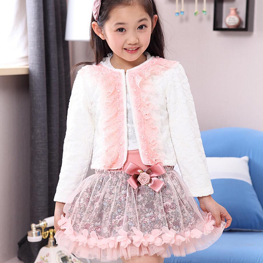 新作 キッズガールズセット3pcsレースアウタージャケット+長袖Tシャツ+フラワースカート春の幼児の女の子のスーツ