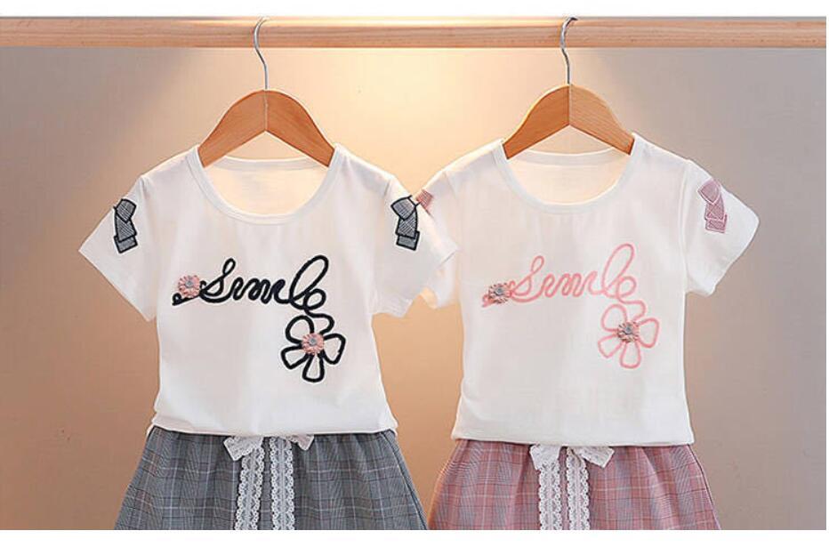 新作 ガールズヴィンテージ洋服スーツ2021サマーホワイト刺繡ボウシャツ+チェック柄スカート2点セットキッズ10代子供用