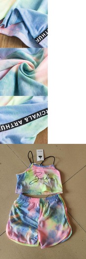 新作 幼児子供服セット女の子夏カラフルプリントレインボースポーツ子供スリングベスト背中の開いたクロップトップショートパンツトラックスーツ