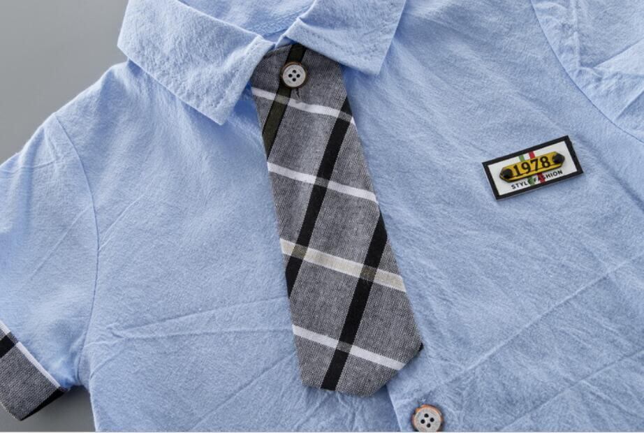 新作 夏の幼児の子供たちの男の子の服半袖シャツトップス蝶ネクタイ+格子縞のショートパンツ2個紳士のマルスーツの衣装