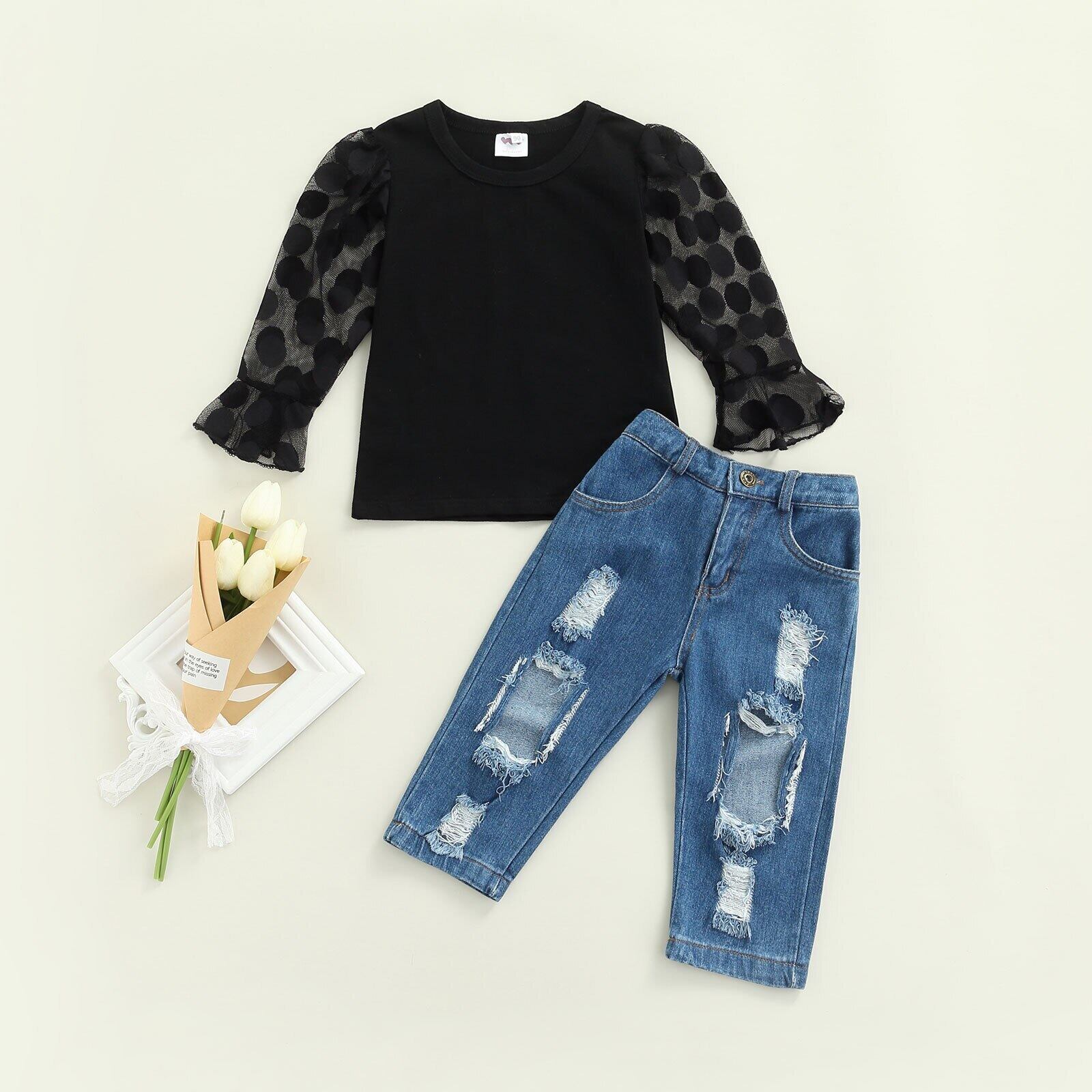 新作 Ma&Baby1-6Y幼児キッドガールズ洋服セットレース長袖トップスデニムパンツ破れたジーンズ春秋服D95