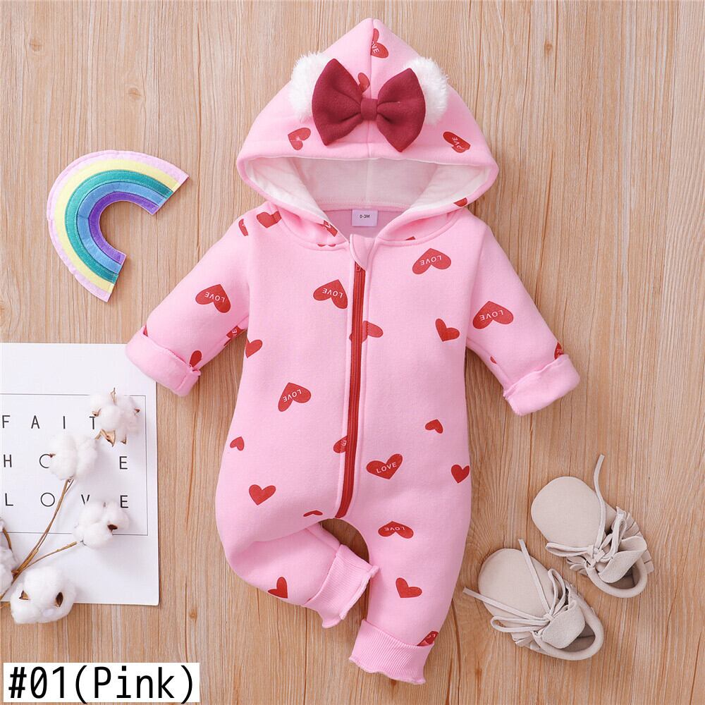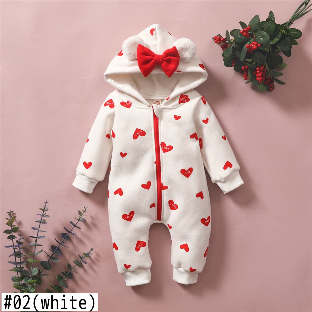 新作 春秋冬 ホワイト ピンク 生まれたばかりの女の赤ちゃん フード付きジャンプスーツ ハートのプリント 長袖ジッパーロンパース バレンタインデー
