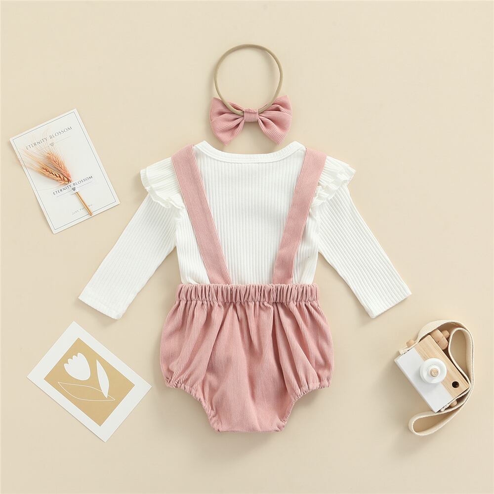 新作 0-18ヶ月生まれの女の赤ちゃん 3個セット キッズ無地リブ 長袖プルオーバートップスサスペンダーパンツヘアバンド春秋