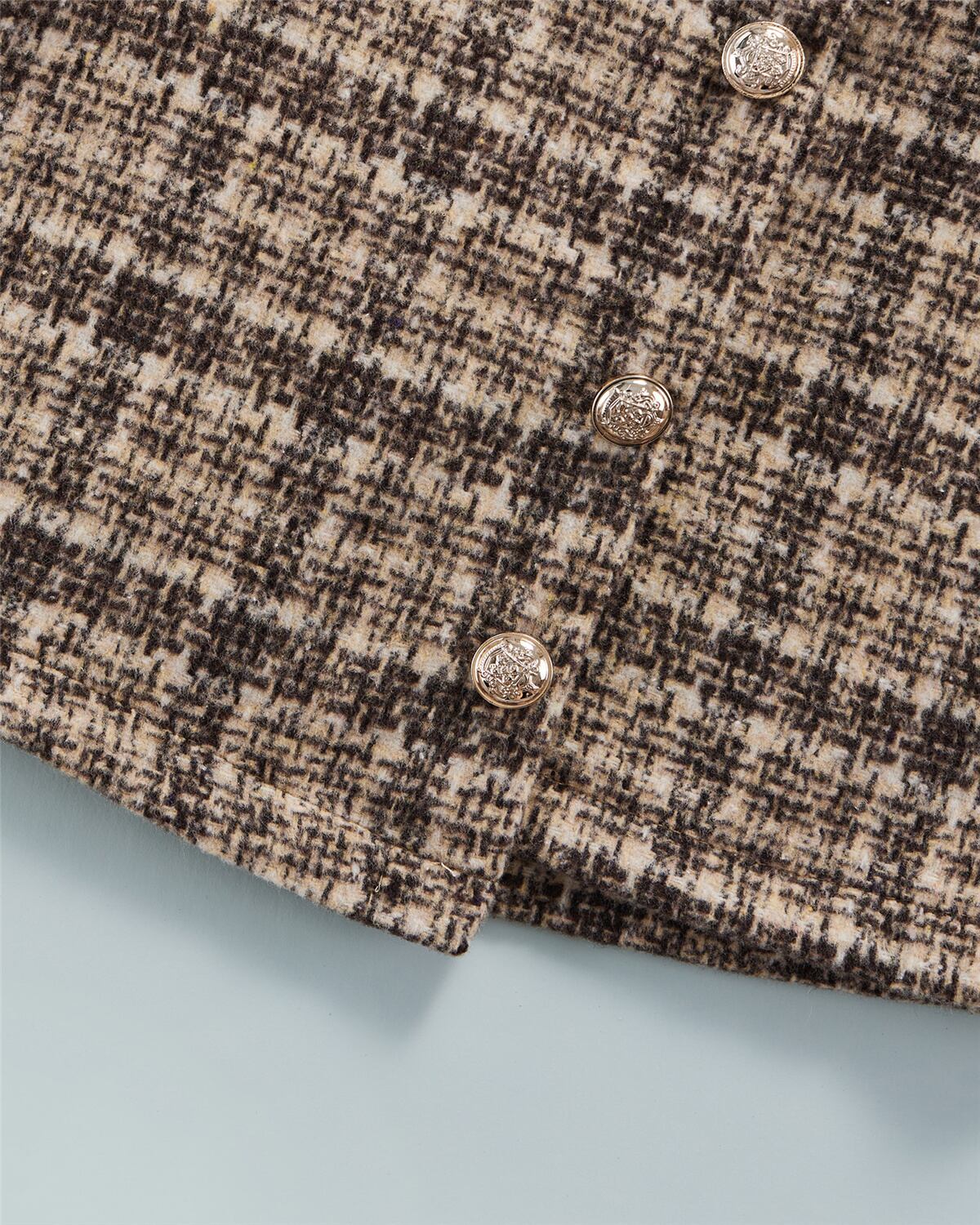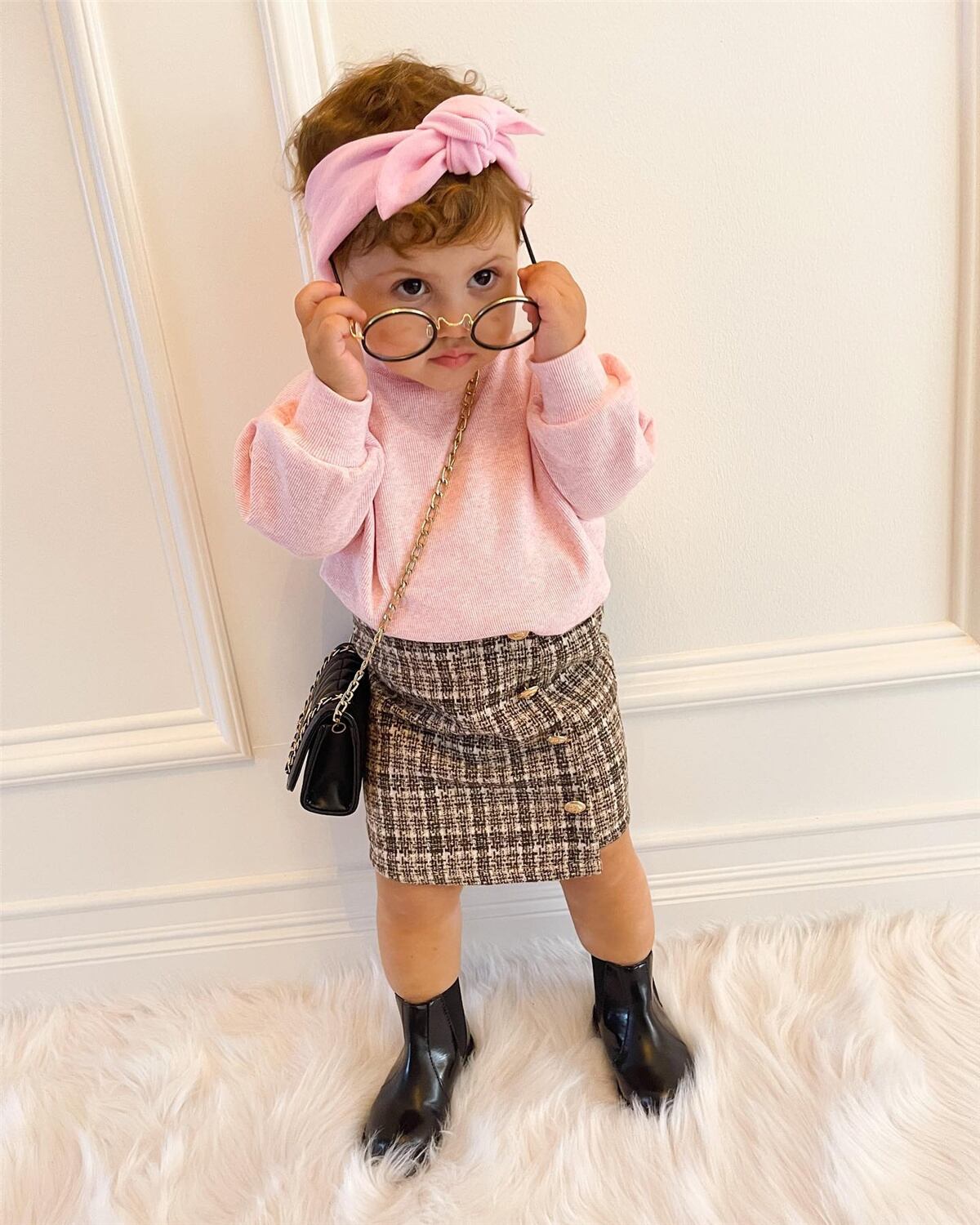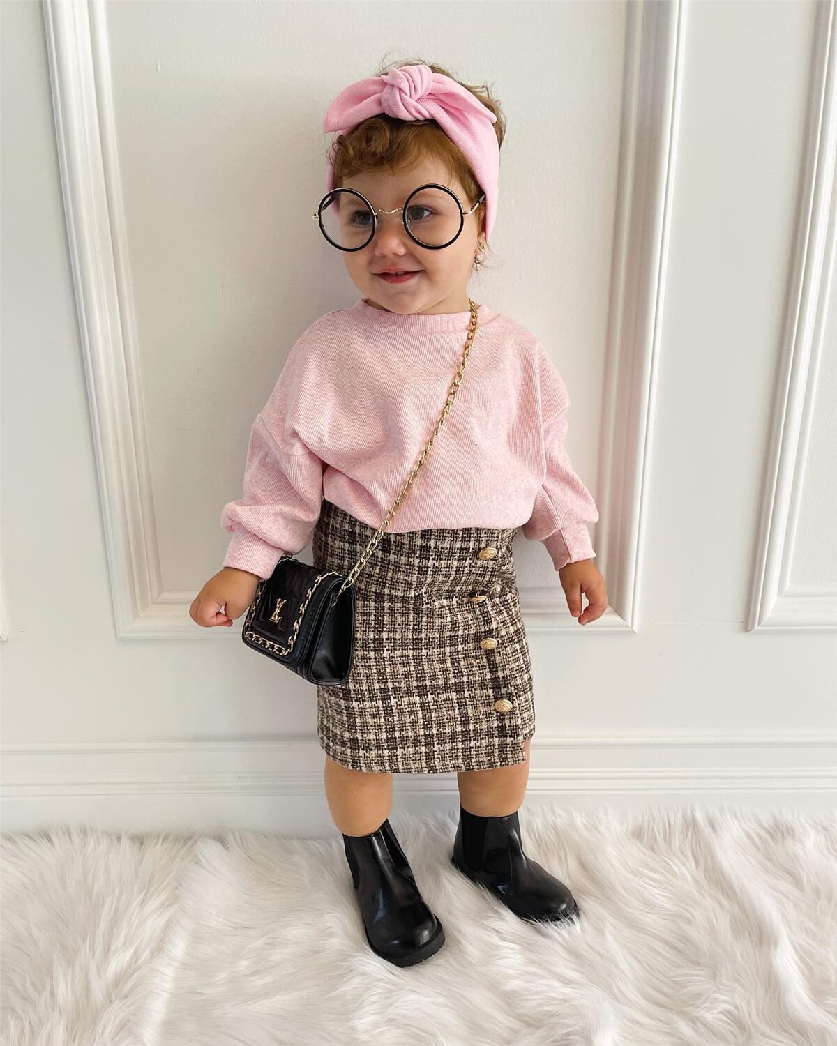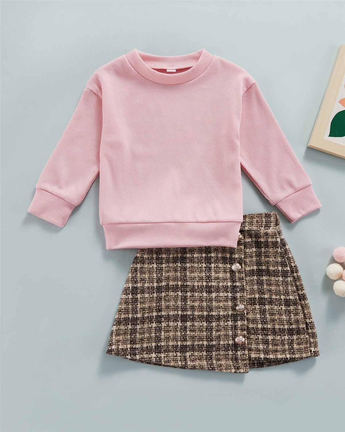 新作 1-6歳の子供幼児の女の赤ちゃん秋冬の衣装長袖無地のスウェットシャツトップス+ウエストチェック柄ボタンスカートセット