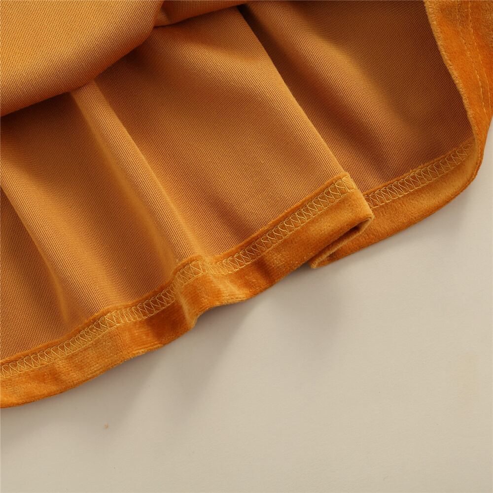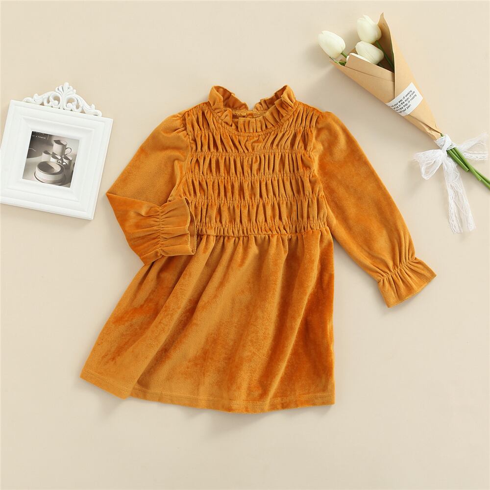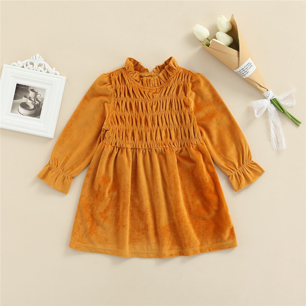 新作 2-7歳キッドガールイエロードレスベビーチルドレンロングスリーブフリル無地Aラインルーズパーティードレス春秋