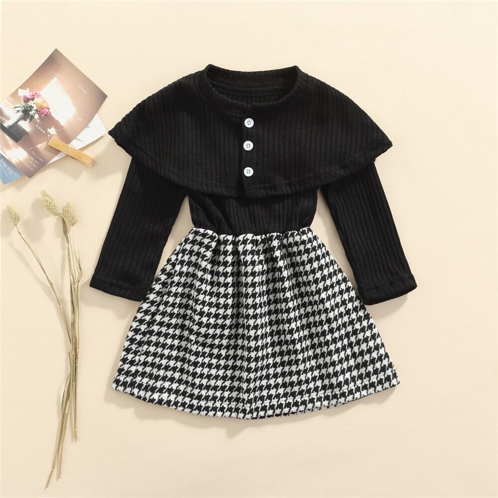 新作 2〜7歳の幼児の女の子2個の衣装キッズカラーブロック千鳥格子ニット長袖Aラインドレス+ボタンショール