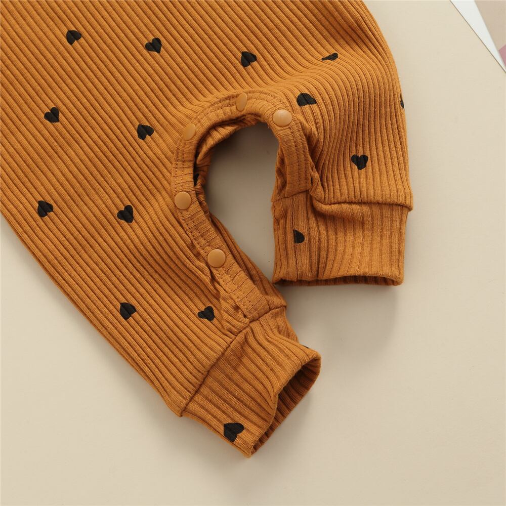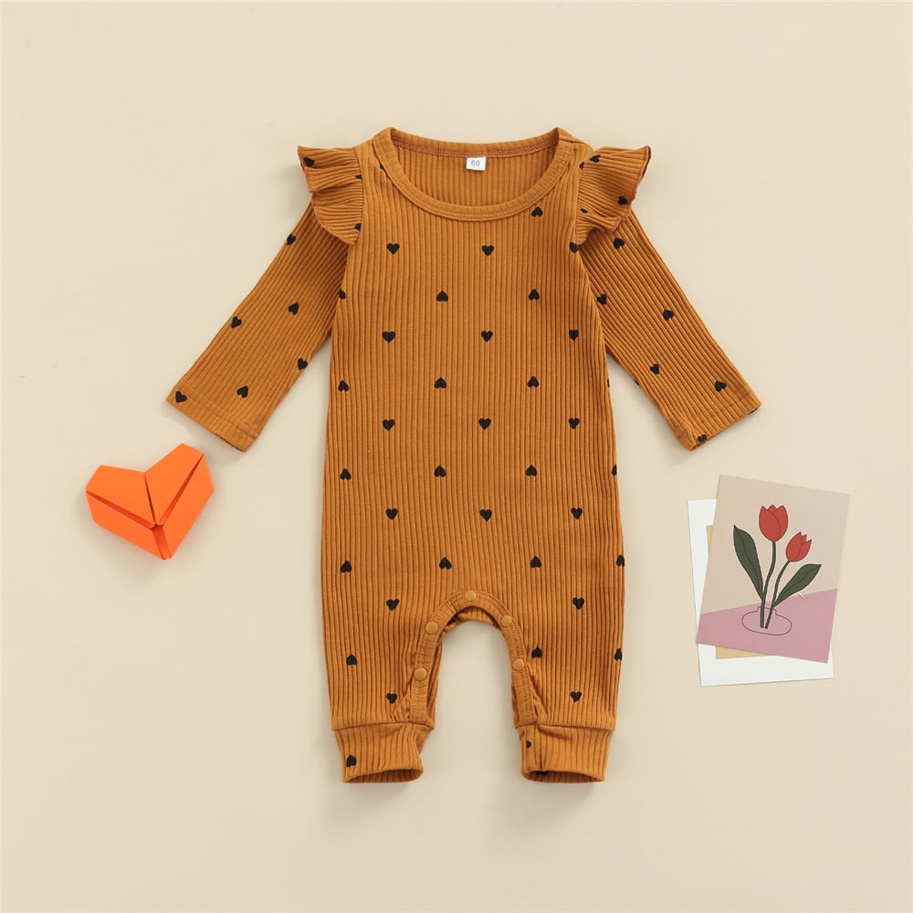 新作 生まれたばかりの赤ちゃん 女の子かわいいハートプリント 長袖ジャンプスーツリブ編みニットフリルロンパース 幼児 子供服 春秋