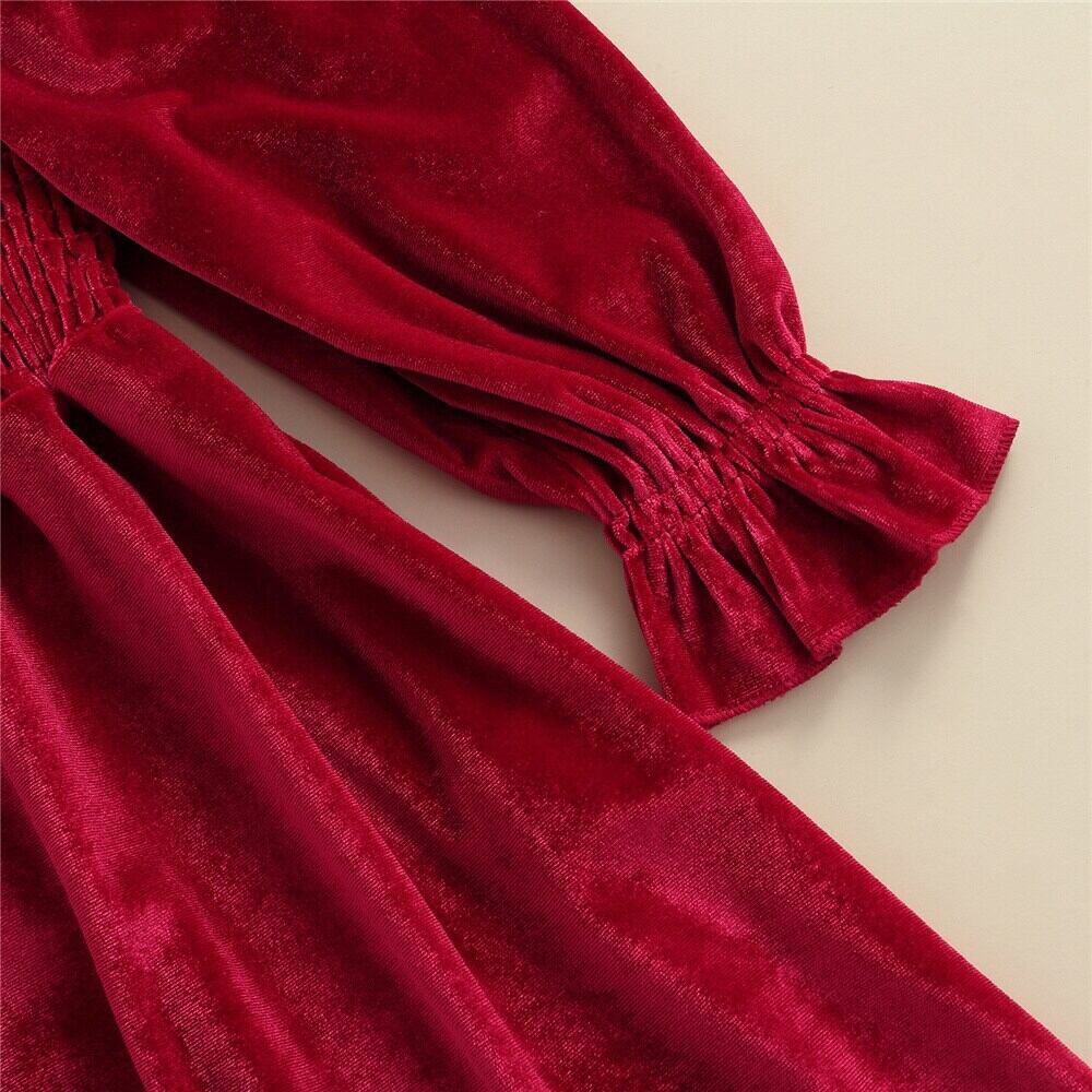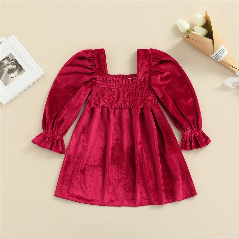 新作 2〜7歳幼児ベビーガールベルベットドレスキッズ長袖無地ウエストルーズフリルスモークAラインドレスレッド