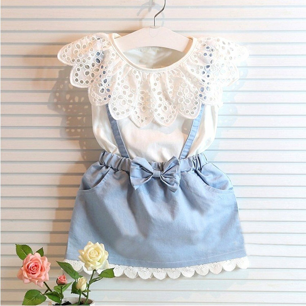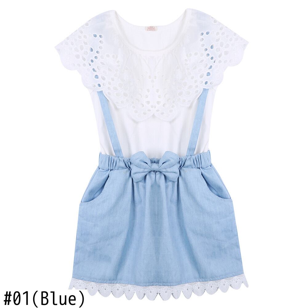新作 夏の幼児キッズベビーガールズ衣装服Tシャツトップス+デニムスカートドレス2PCSセット