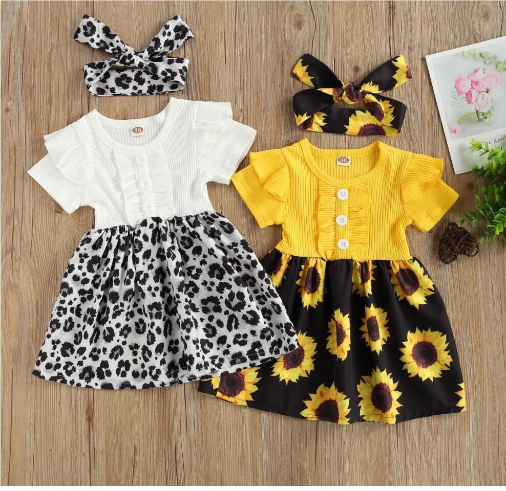 新作 夏の幼児キッズガールズドレスひまわり/ヒョウ柄パッチワーク半袖膝丈Aラインドレスヘッドバンドベビー1-5歳