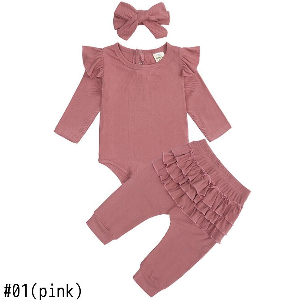 新作 幼児キッズ ベビーガール 春秋 ソリッド ロンパース フリルパンツ+ヘッドバンド衣装3PCSセットボーンズスーツ