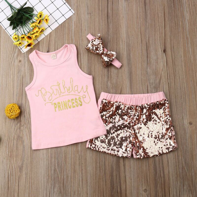 新作 夏の幼児の女の赤ちゃんトップスパンコールショーツ3個の衣装セット服2-7Y