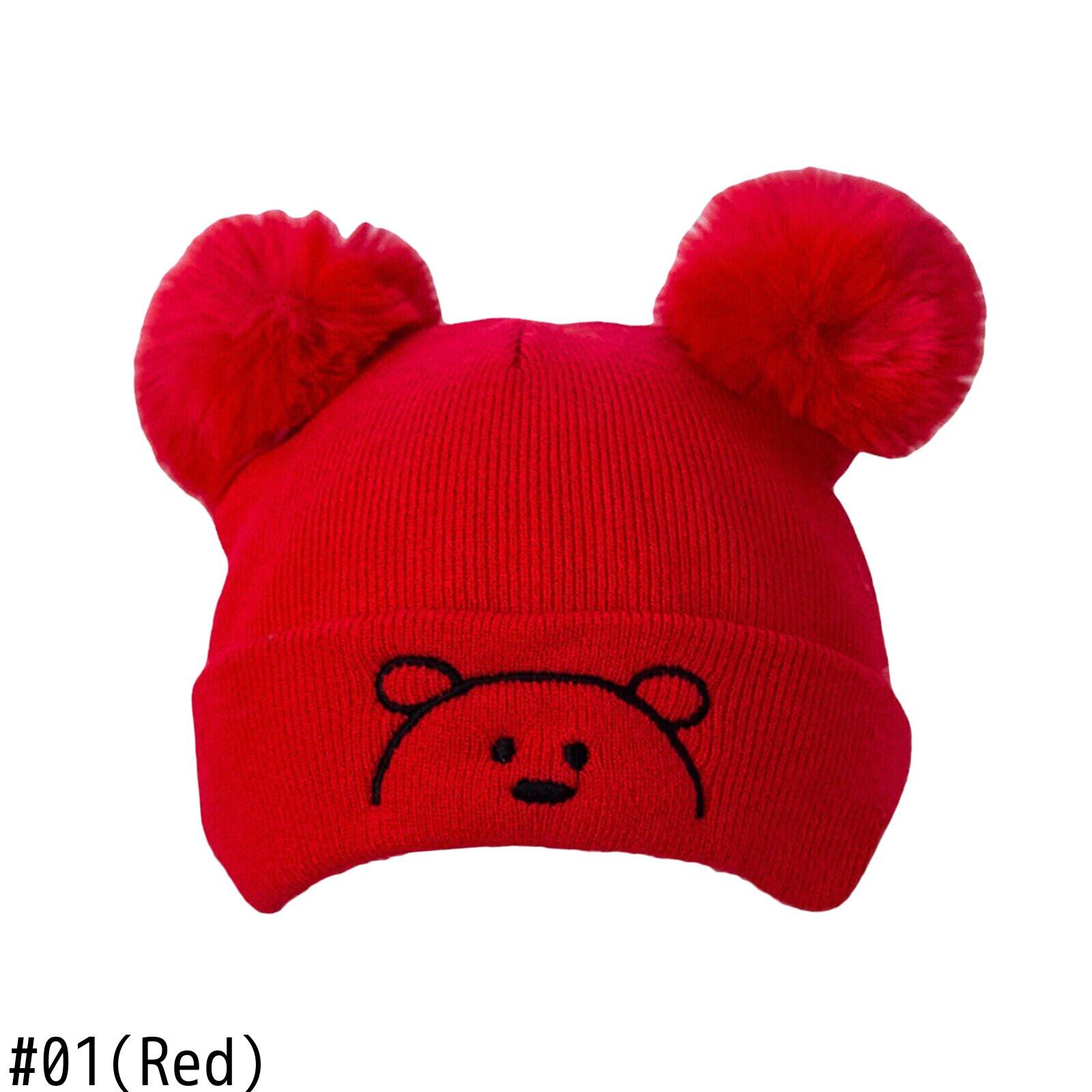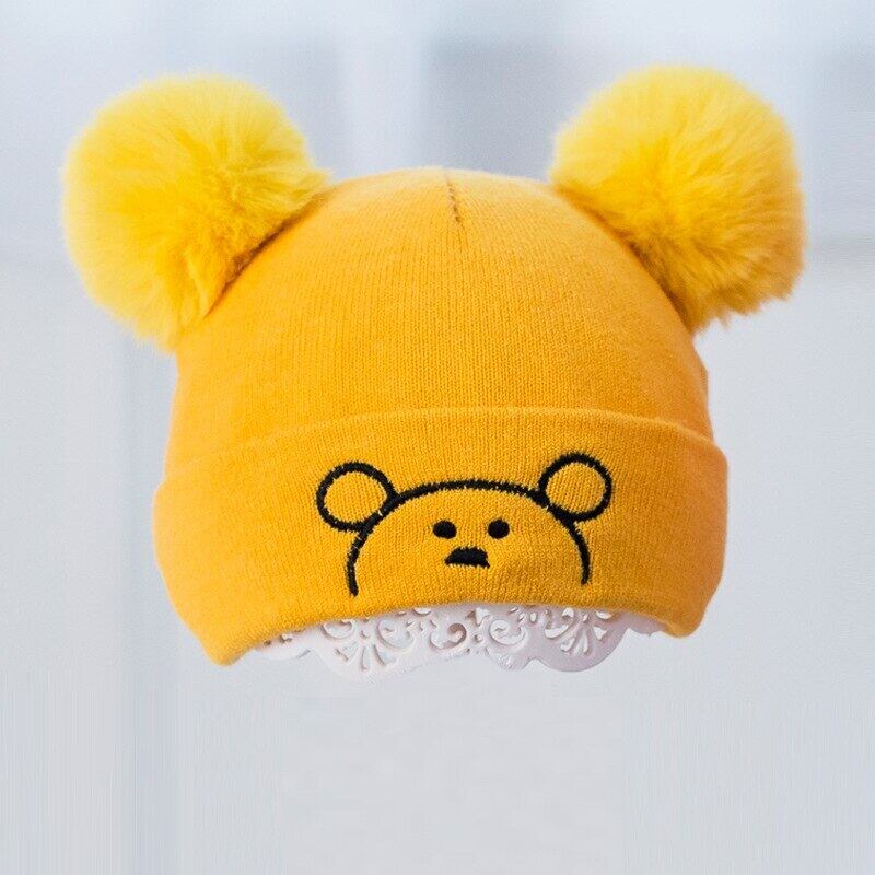 新作 ベビーハット漫画クマの顔刺繡ダブルヘアボールドットニットダブルレイヤーウォームビーニーハット