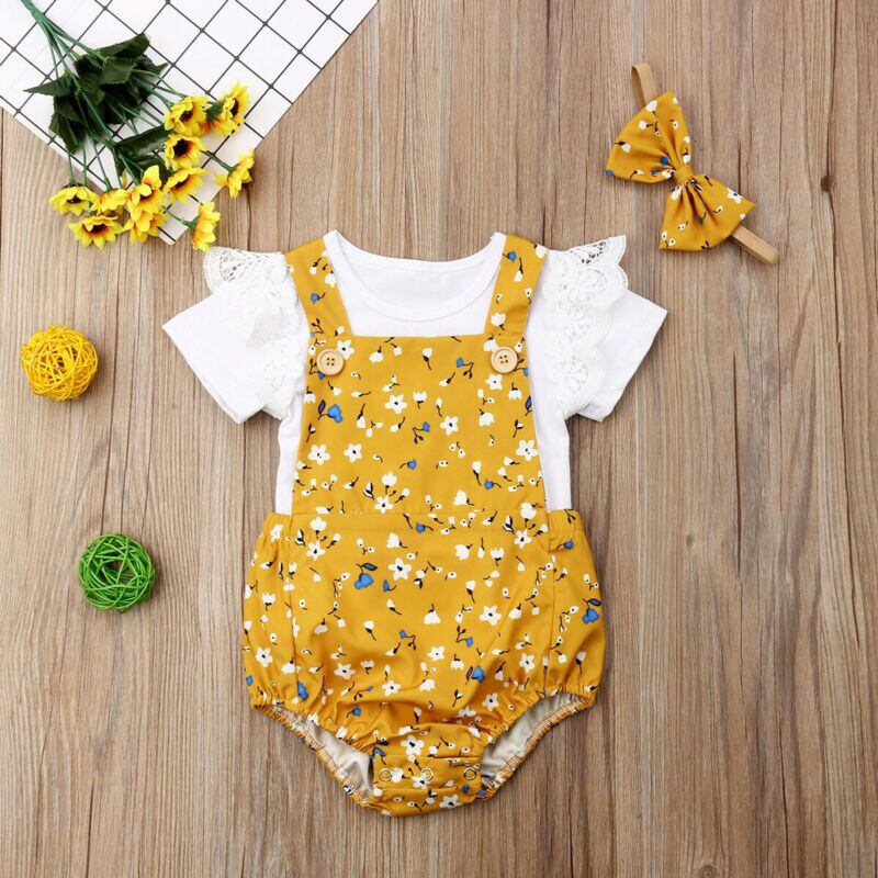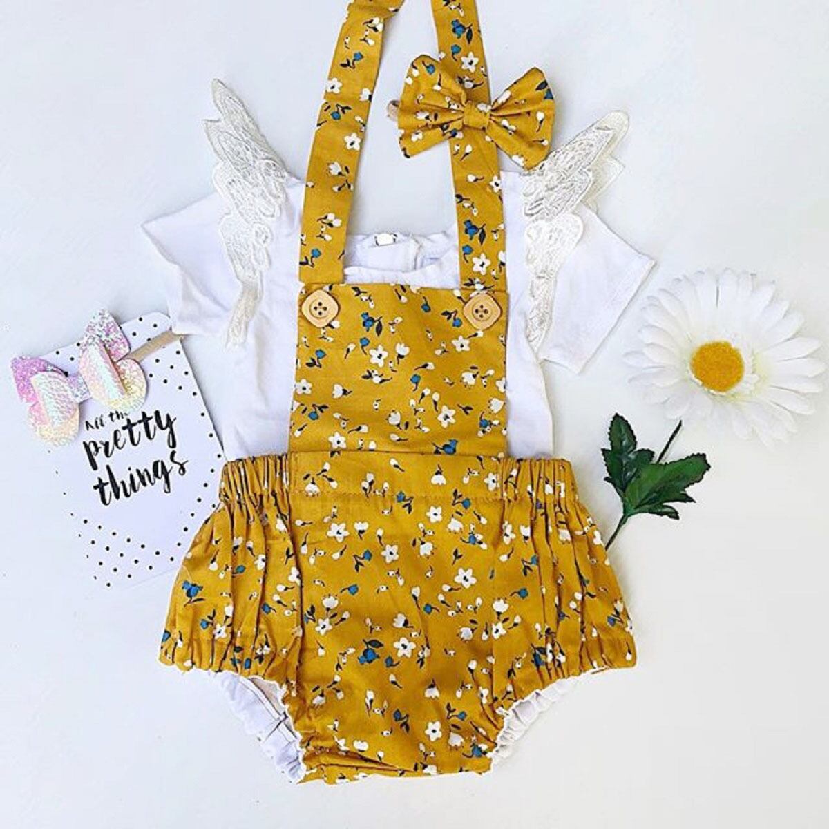 新作 3PCS生まれの女の赤ちゃんの服ロンパース+オーバーオールショーツ+フローラル3個夏服