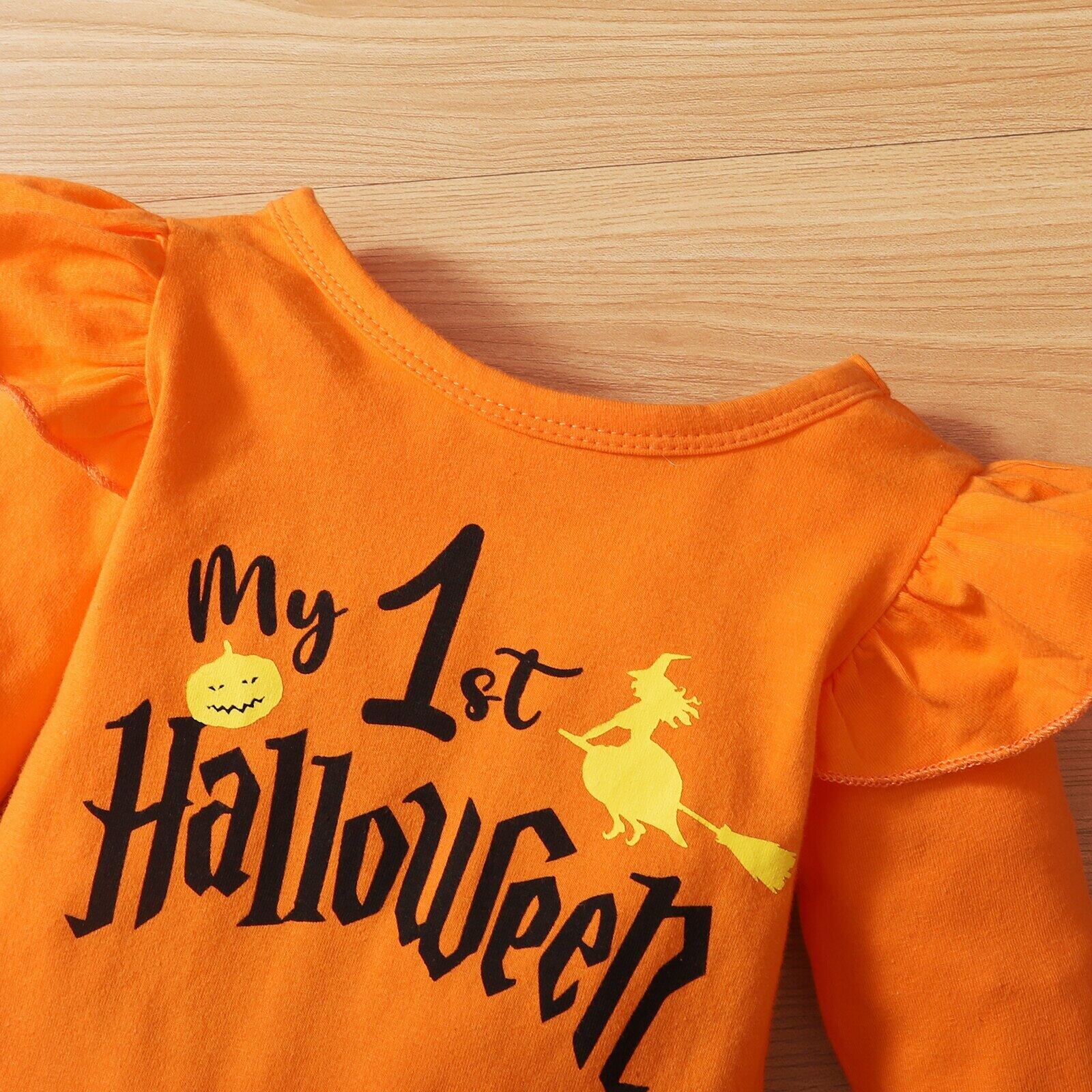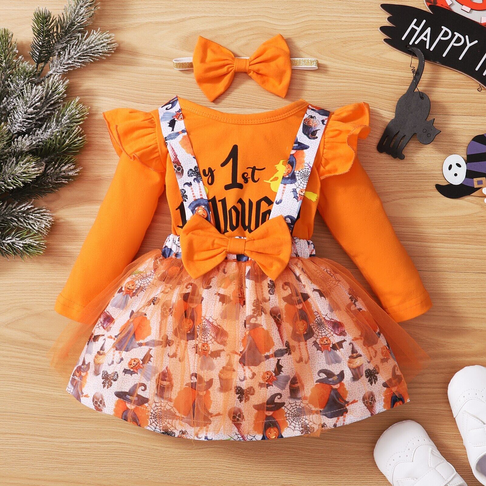 新作 3pcs幼児の女の赤ちゃんの服セット0-18Mレターパンプキンプリントフライスリーブロンパーストップスメッシュストラップスカート