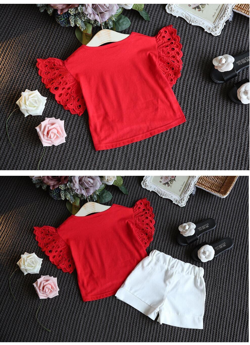 新作 キッズスーツサマーガールズくり抜きスリーブブラウストップスシャツ+ホワイトショーツベビーキッズ2PCSセット