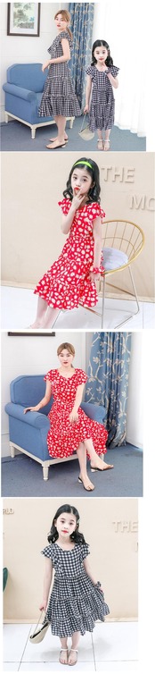 新作 母娘フローラルプリントファミリードレスサマー半袖チェック柄ビッグスイングビーチドレスママとミーファミリーマッチング服