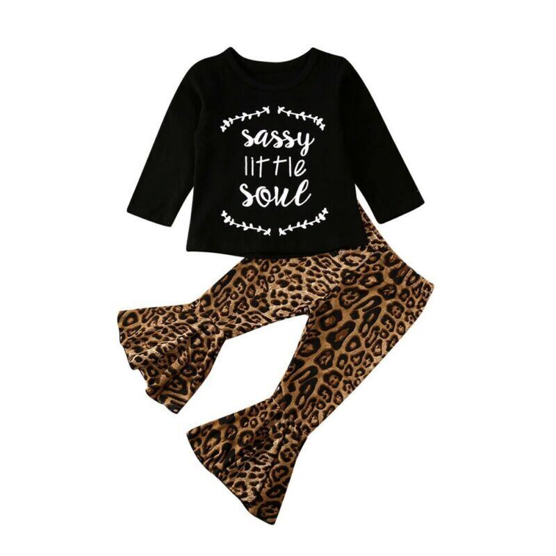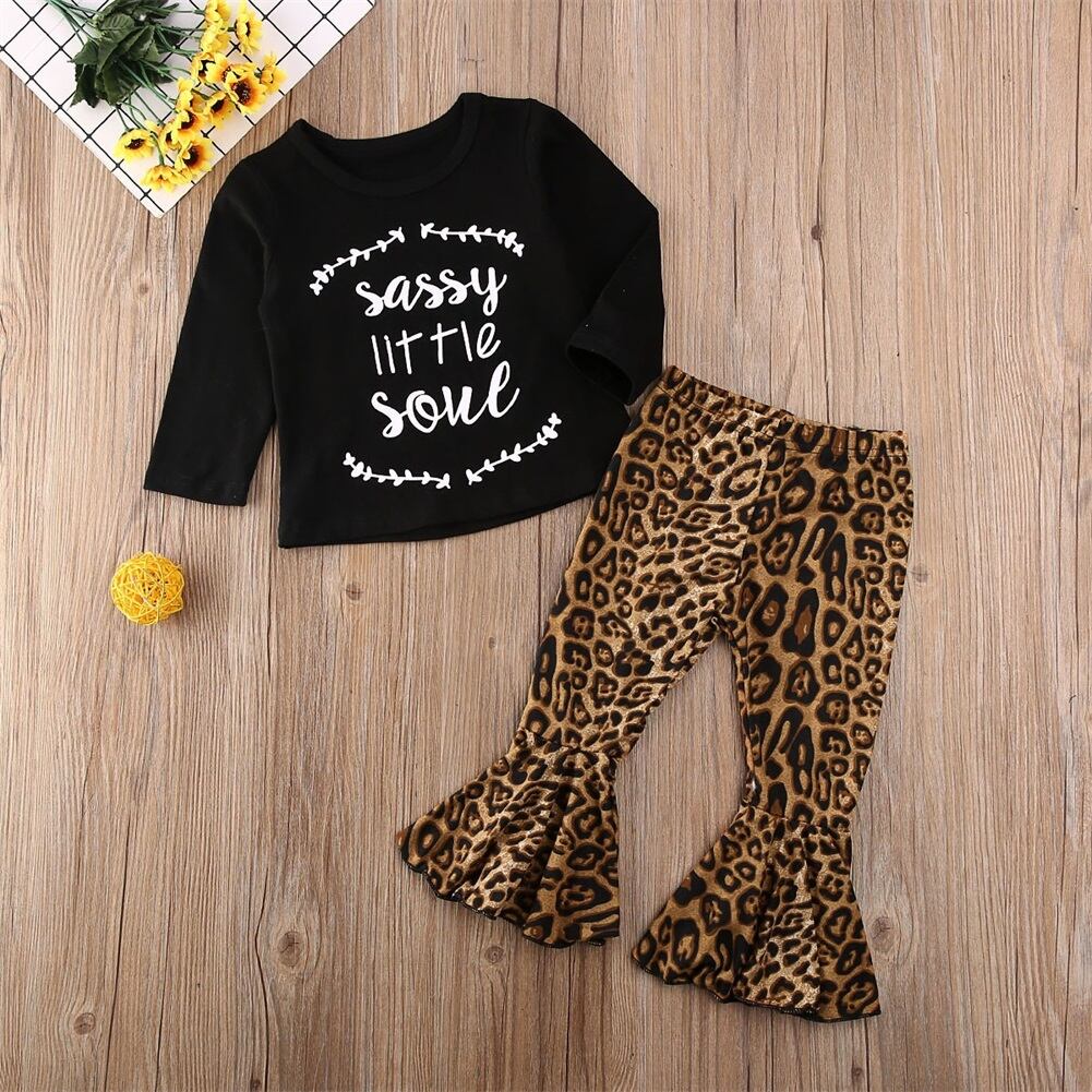 新作 幼児の赤ちゃんキッズガールヒョウ柄の服長袖レターTシャツトップ&フレアパンツズボン衣装1-6Y
