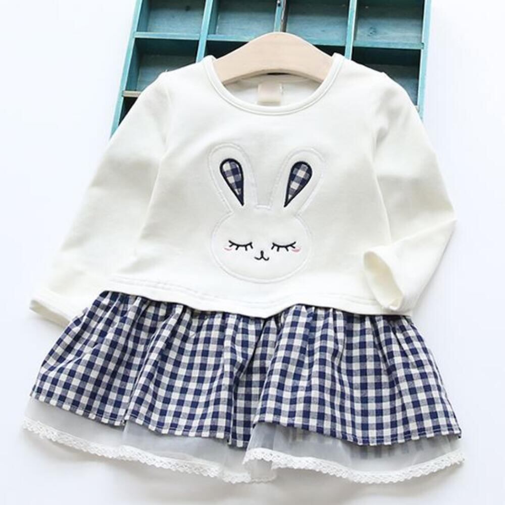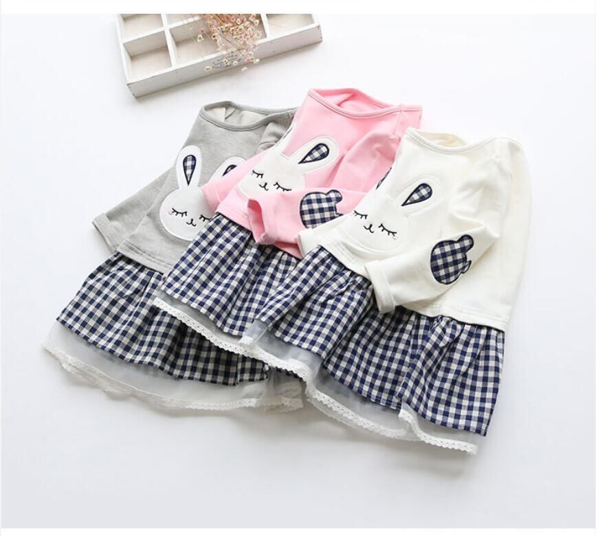 新作 ガールズ春服ピンク/ホワイトベビーキッズドレスチェック柄ステッチラビットラウンドネックキッズガールズドレス