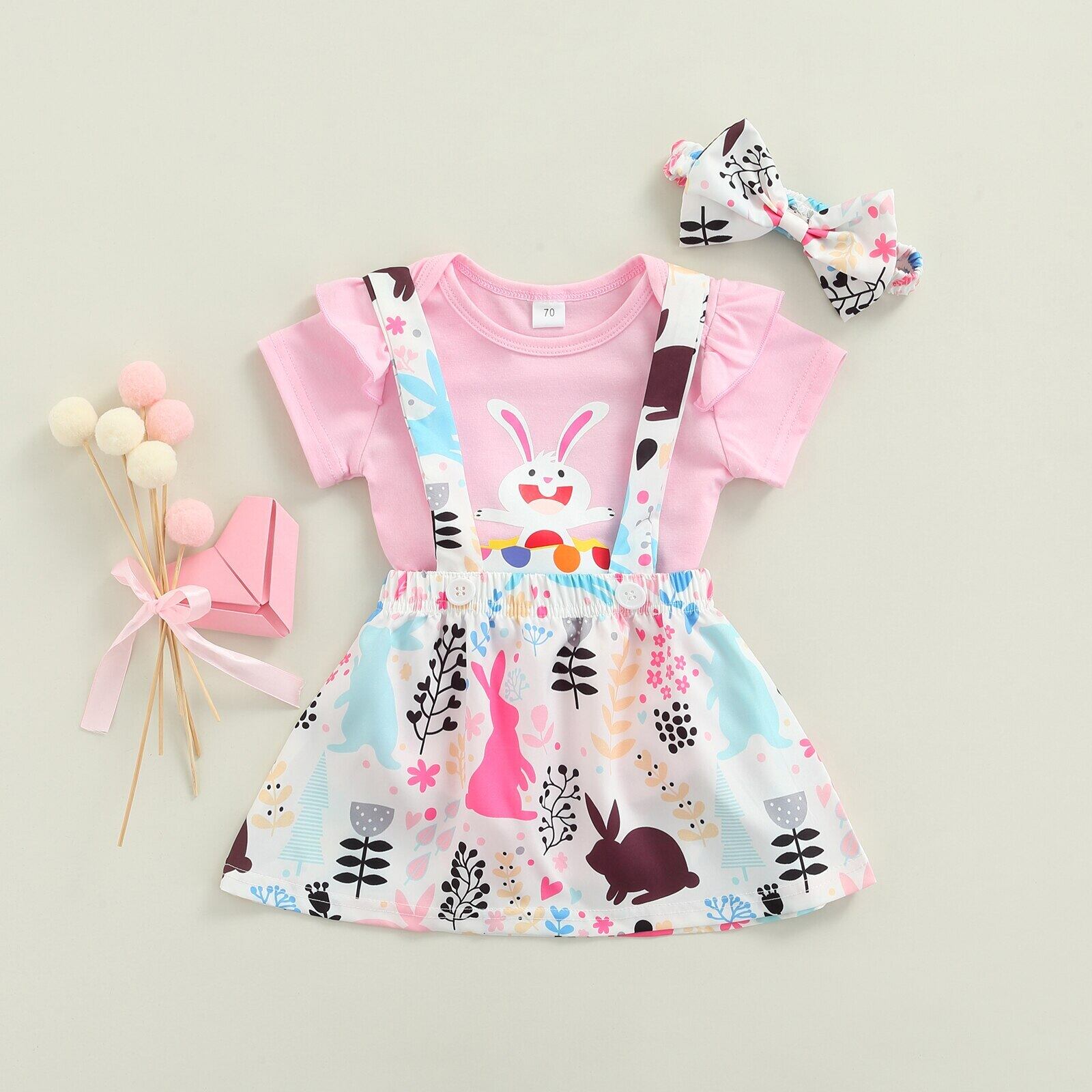 新作 0-24Mイースター生まれの幼児用 ベビーガール服セットバニー半袖ロンパース フリルスカート オーバーオール衣装D35